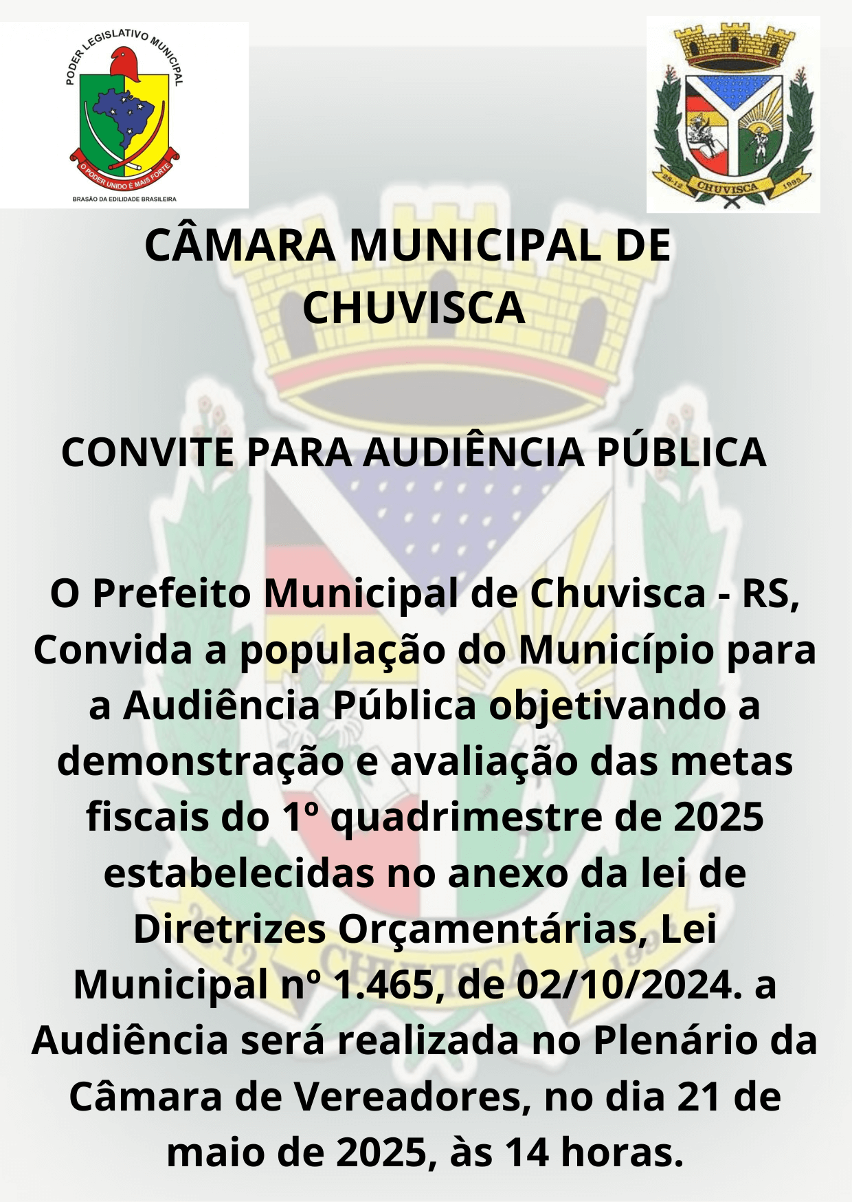 Audiência Pública para demonstração e avaliação das metas fiscais do 1º quadrimestre de 2025 estabelecidas no anexo da lei de Diretrizes Orçamentárias, Lei Municipal nº 1.465, de 02/10/2024, no dia 21 de maio de 2025, às 14 horas no Plenário da Câmara Municipal.