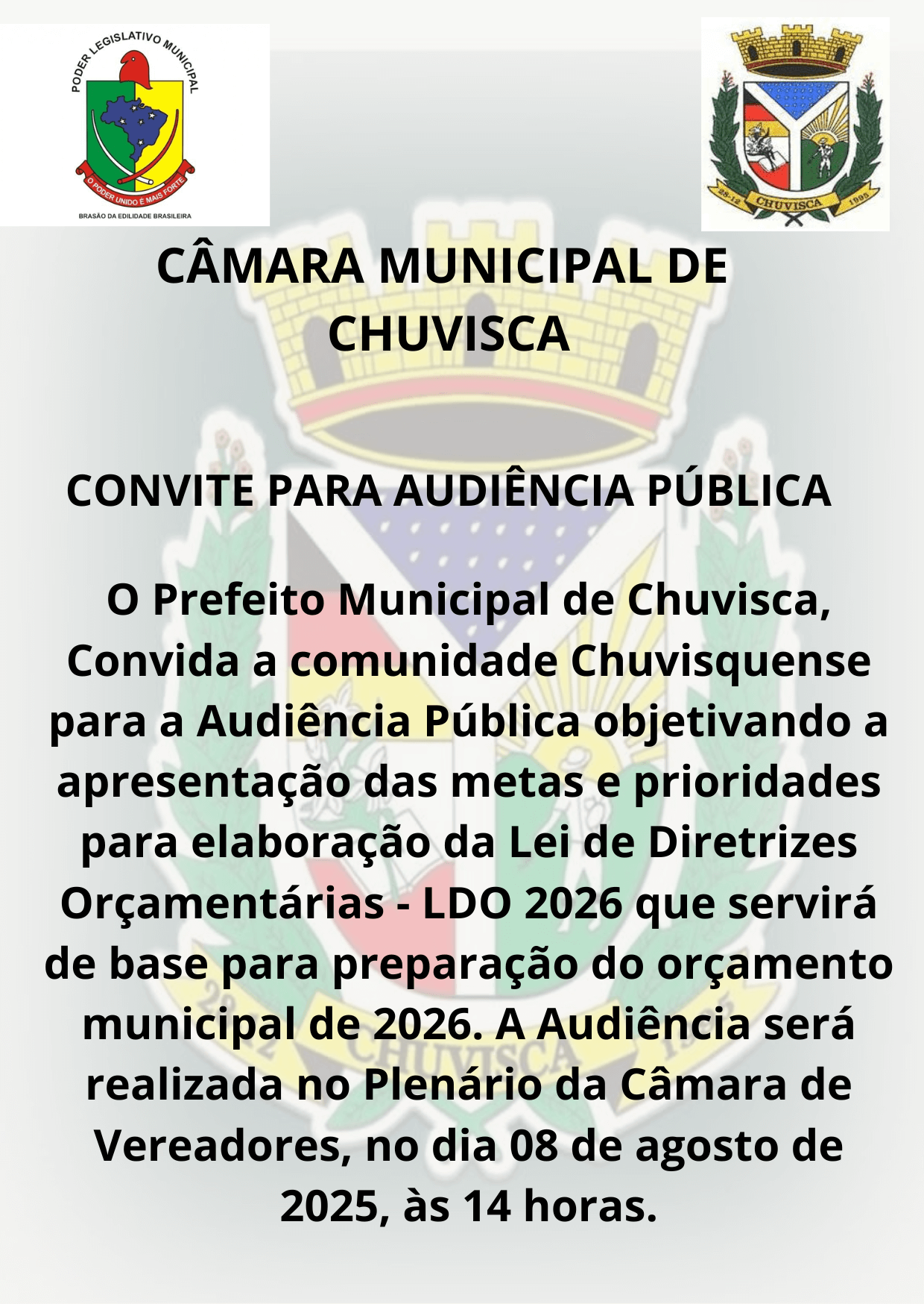Audiência Públicao bjetivando a apresentação das metas e prioridades para elaboração da Lei de Diretrizes Orçamentárias - LDO 2026 que servirá de base para preparação do orçamento municipal de 2026., no dia 08 de agosto de 2025, às 14 horas no Plenário da Câmara Municipal.