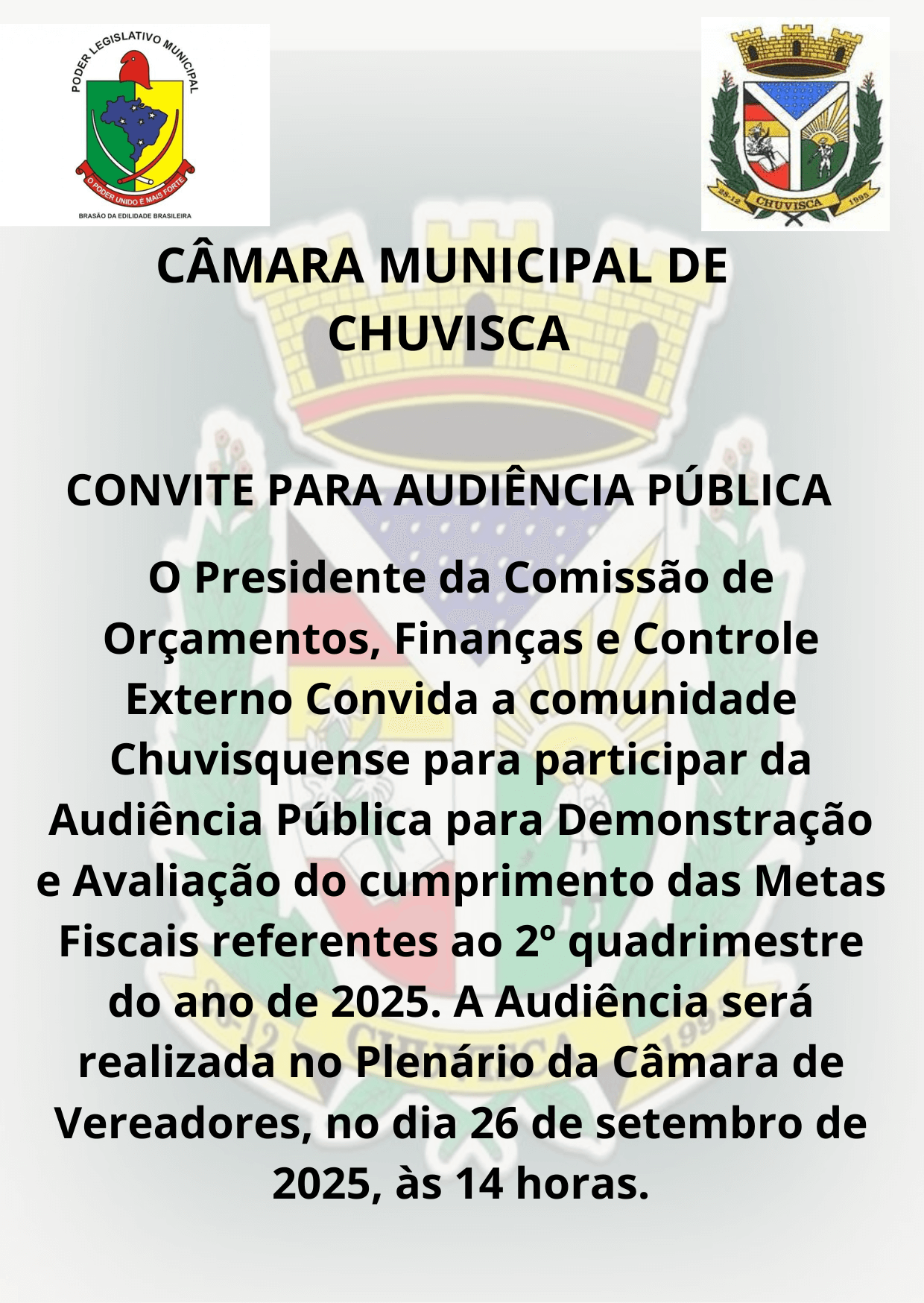 Audiência Pública para demonstraçõa e avaliação do cumprimento das Metas Fiscais referentes ao 2º quadrimestre do ano de 2025, às 14 horas no Plenário da Câmara Municipal.