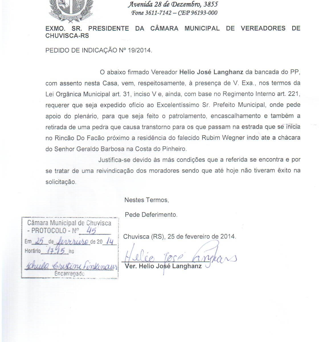 Vereador(es): Helio José Langhanz, Helio José Langhanz, Helio José Langhanz, Helio José Langhanz