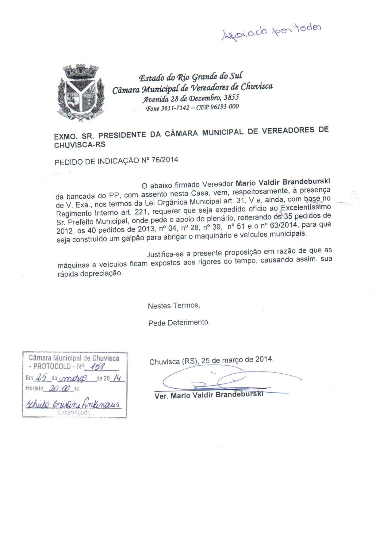 Vereador(es): Mario Valdir Brandeburski, Mario Valdir Brandeburski, Mario Valdir Brandeburski, Mario Valdir Brandeburski