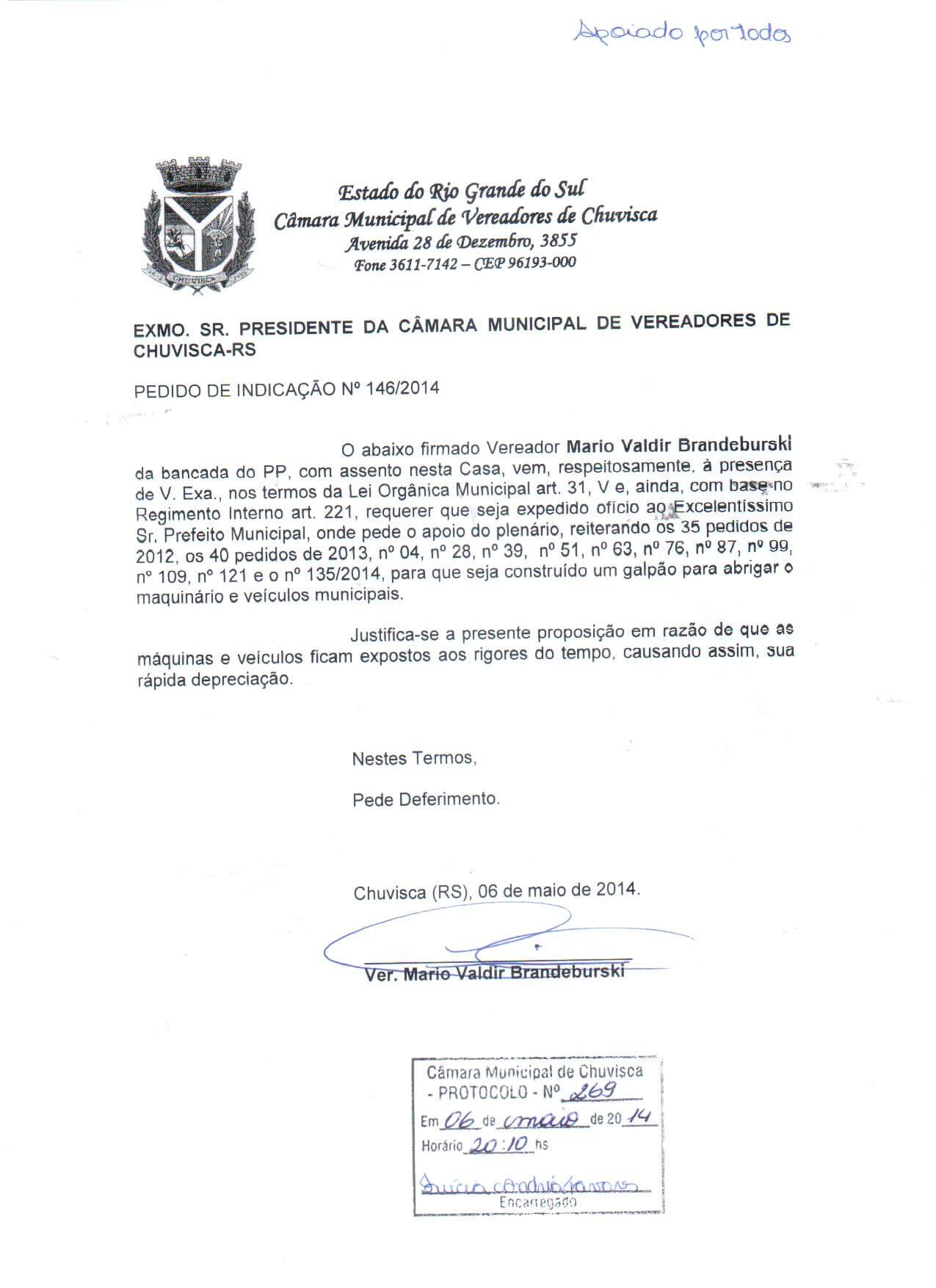 Vereador(es): Mario Valdir Brandeburski, Mario Valdir Brandeburski, Mario Valdir Brandeburski, Mario Valdir Brandeburski, Mario Valdir Brandeburski