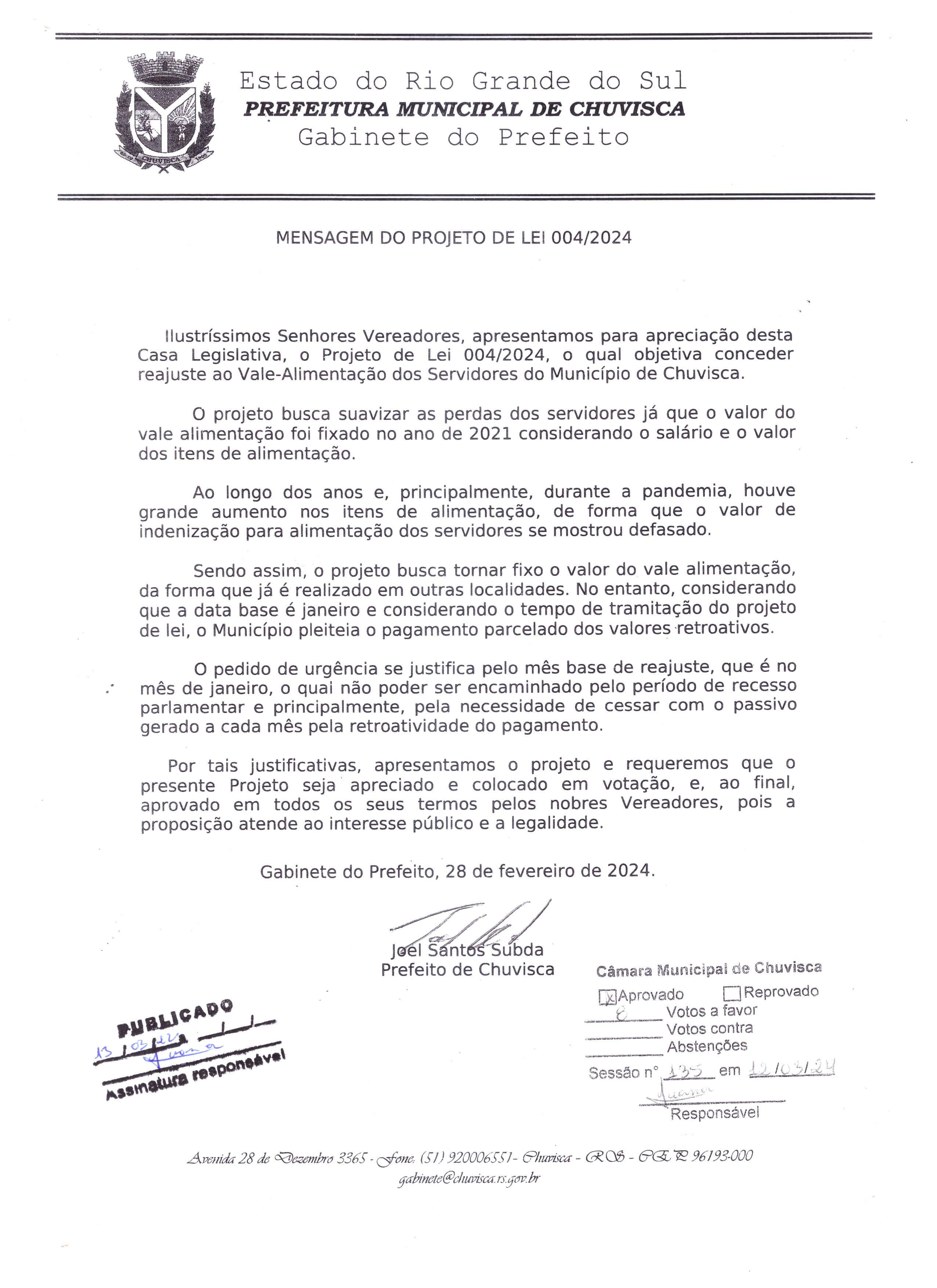 Titulo: Projeto de Lei nº004/2024, Reajuste do Vale alimentação