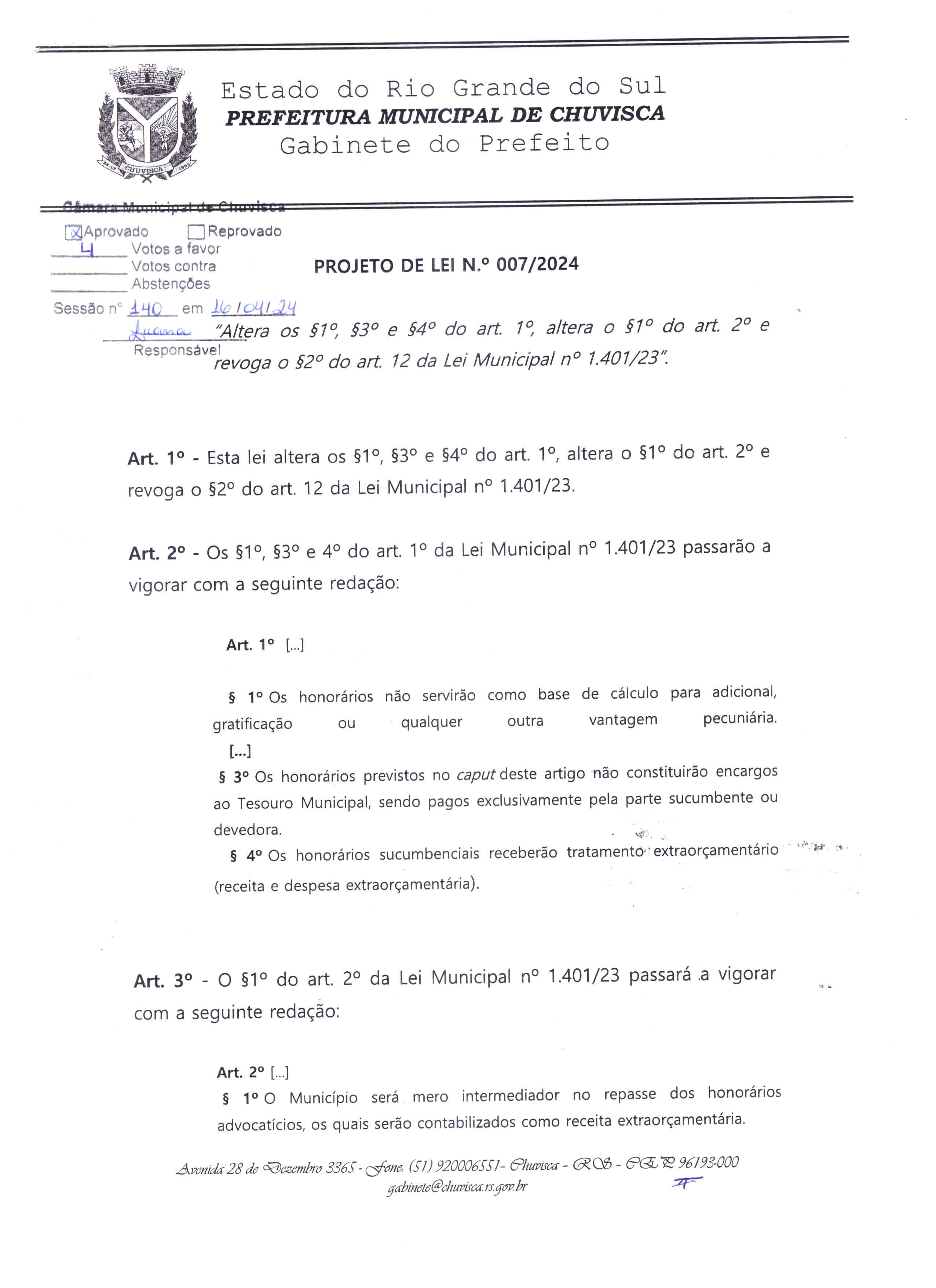 Titulo: Projeto de Lei nº007/2024, Honorários Advocatícios