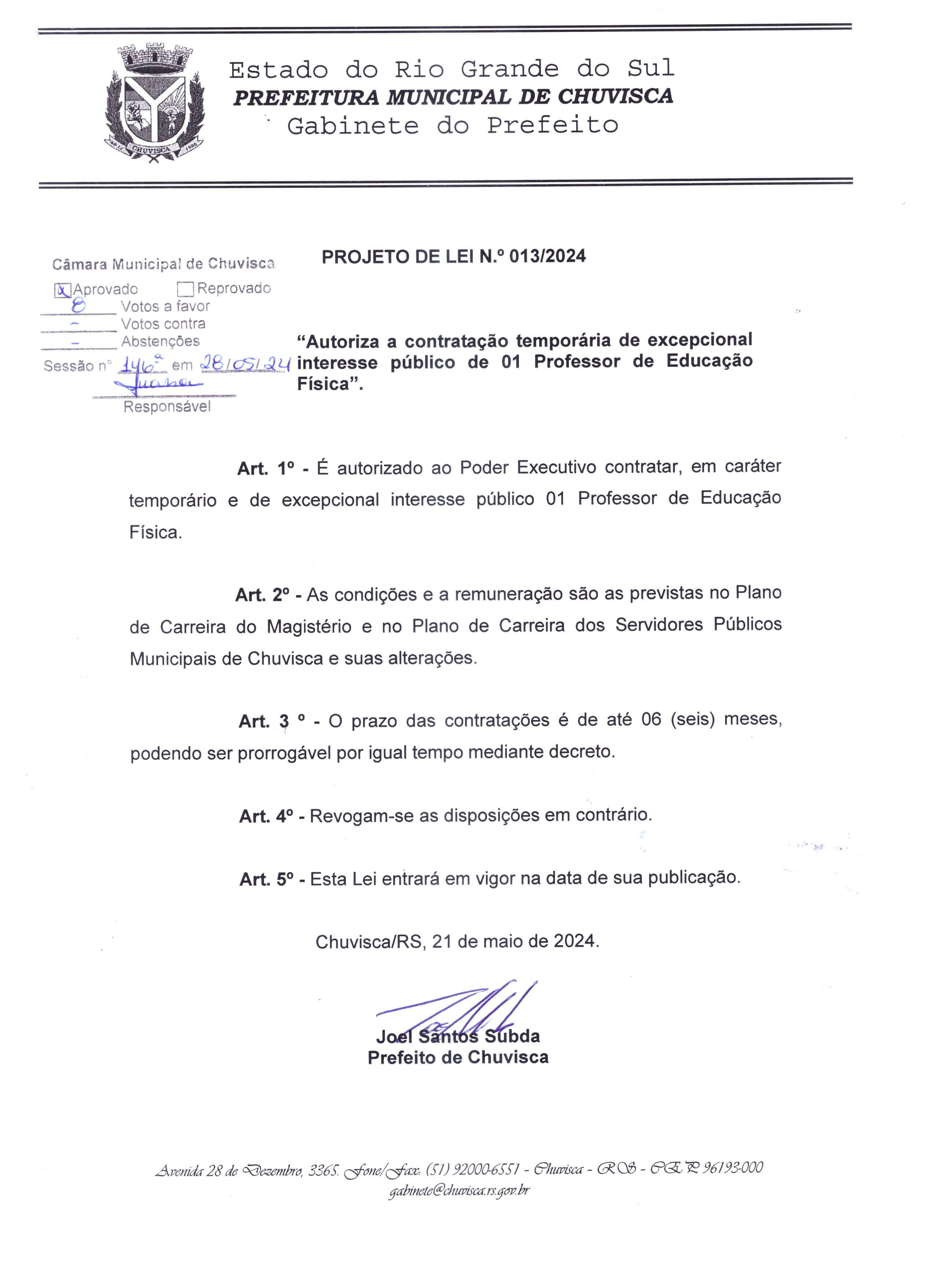Titulo: Projeto de Lei nº013/2024, Contratação de 01 Professor de Educação Física