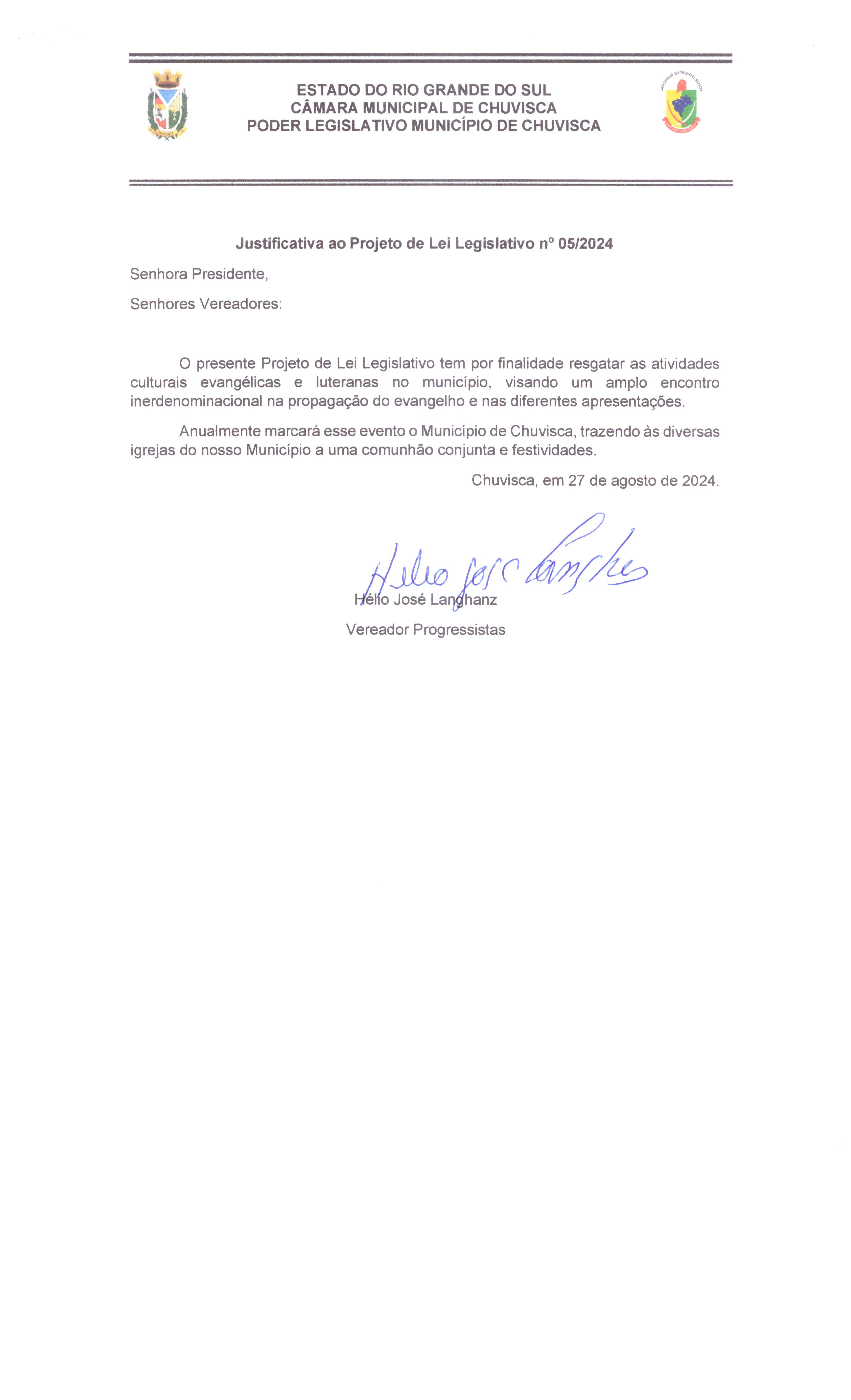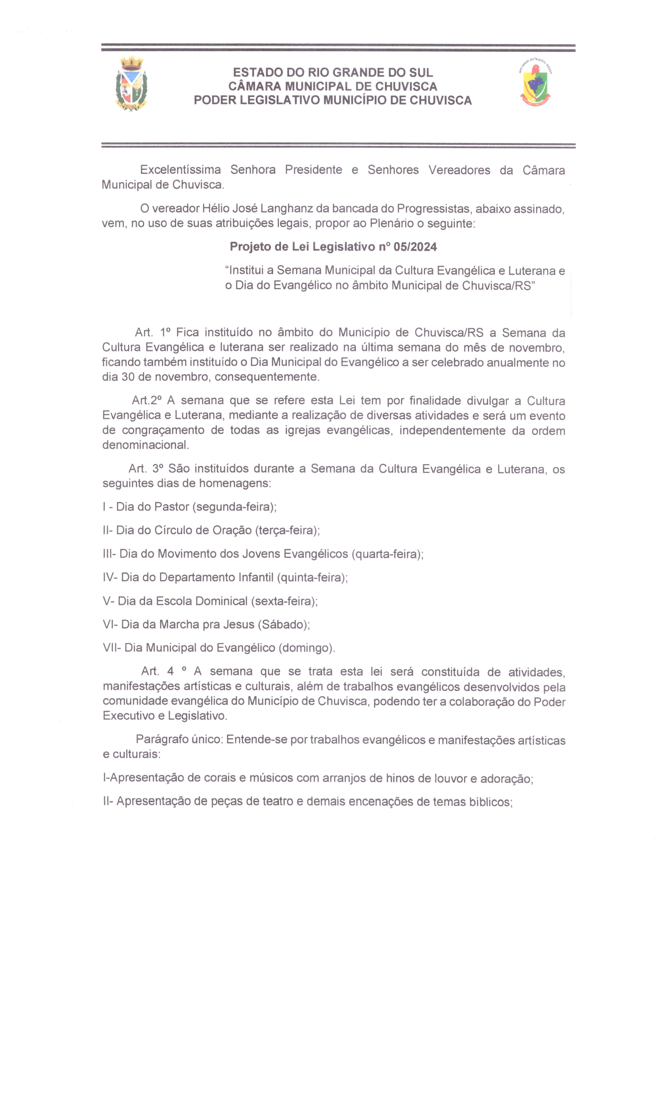 Titulo: Projeto de Lei nº005/2024, Institui o dia do Evangélico