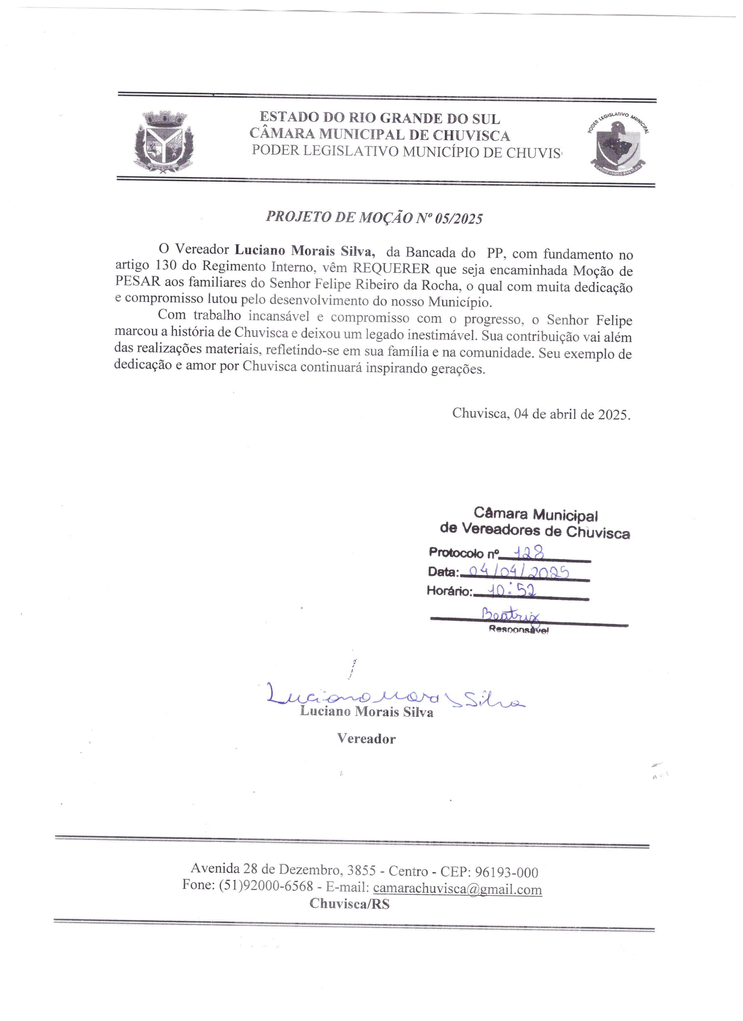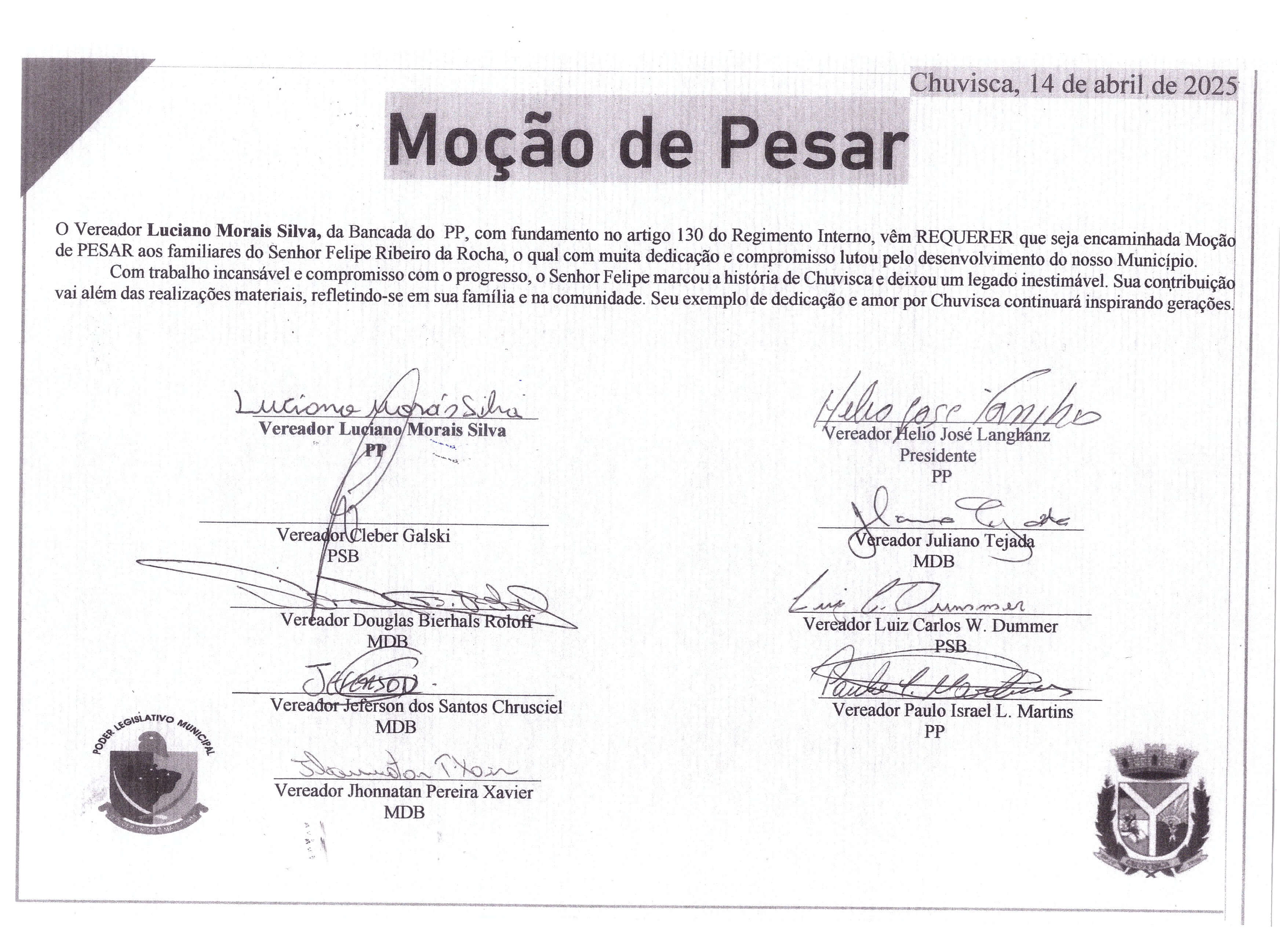 Moção de Pesar aos familiares do Senhor Felipe Ribeiro da Rocha.