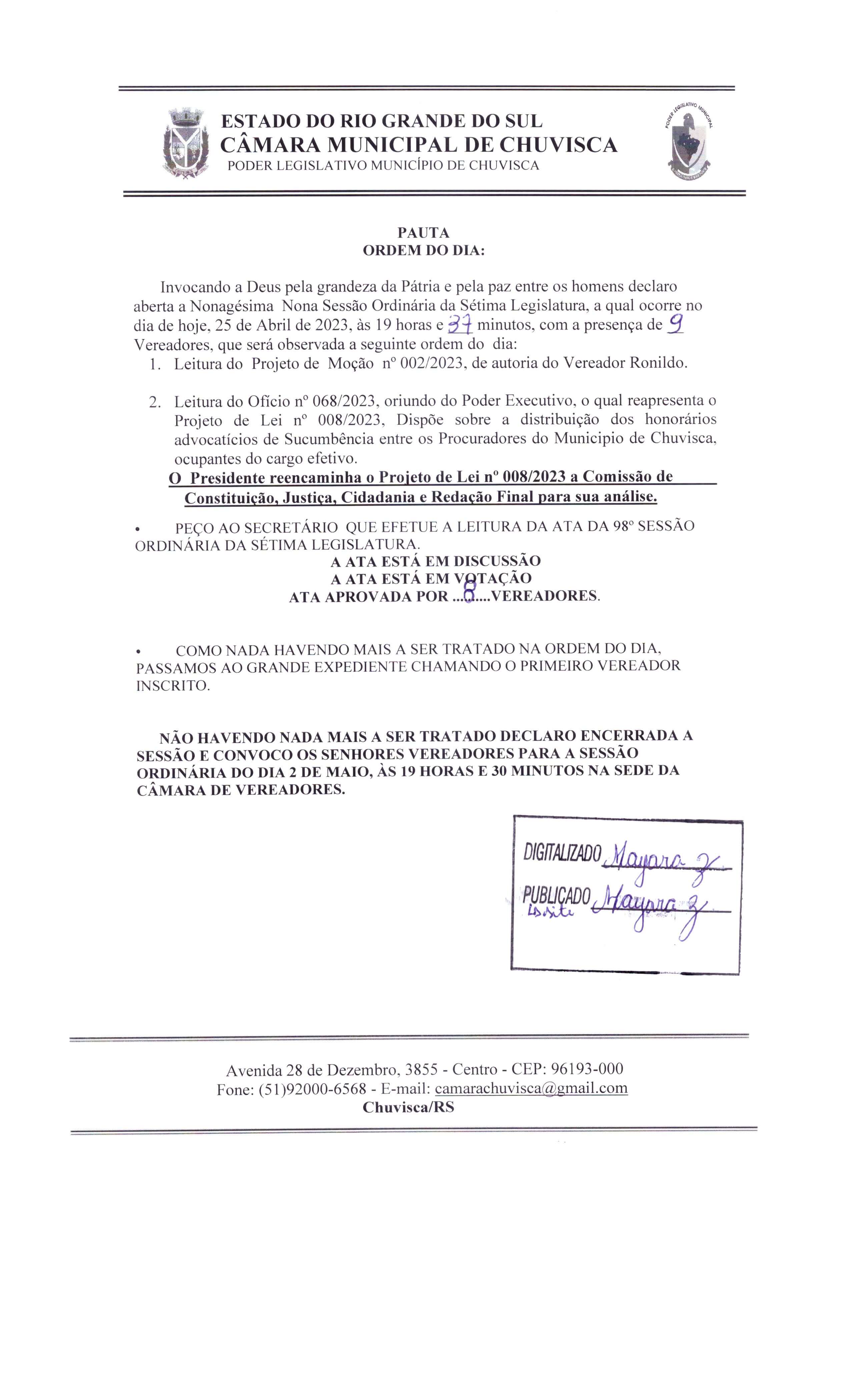 Ordem do dia 99º Sessão Ordinária da 7º Legislatura