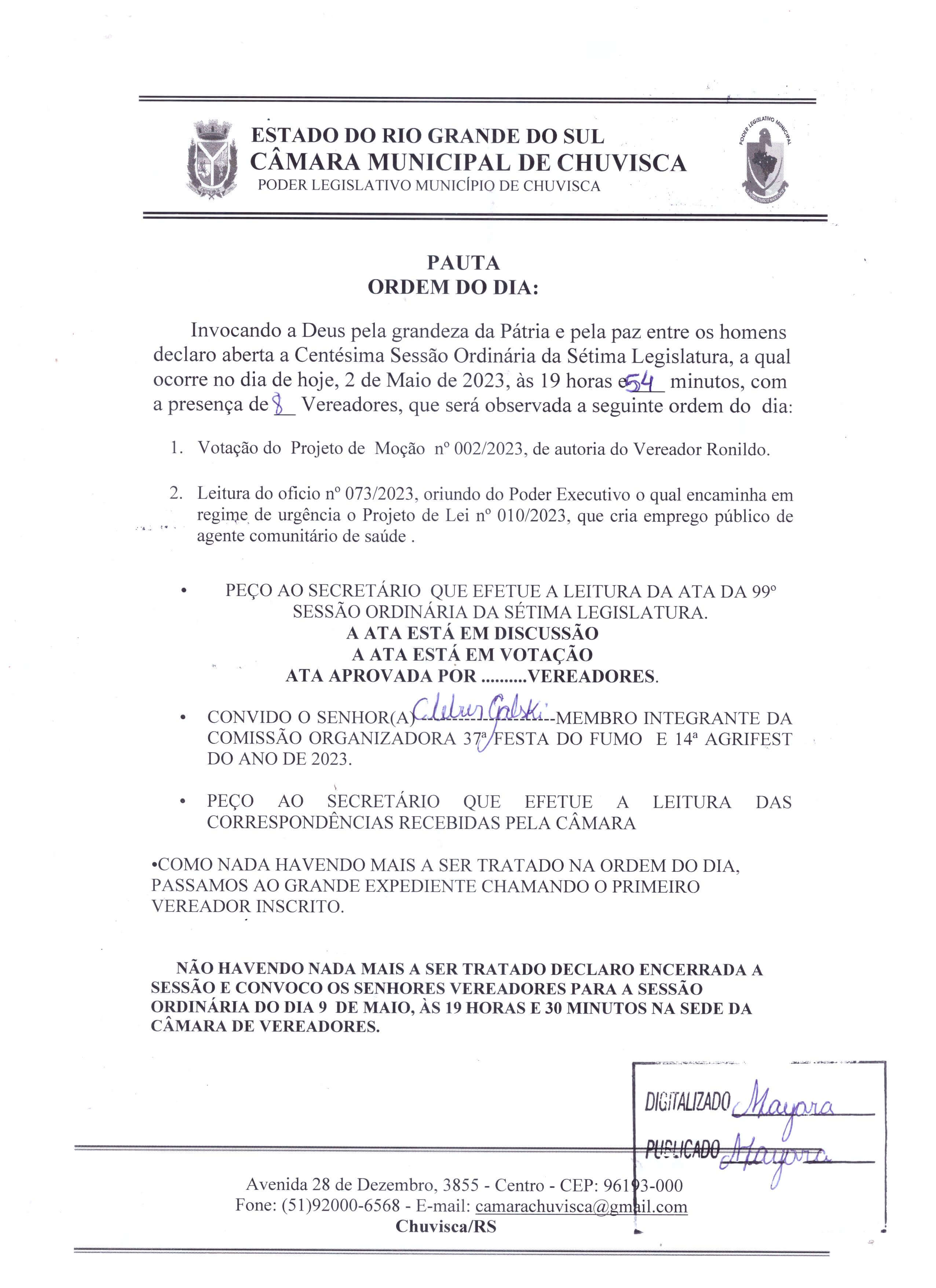 Ordem do dia 100º Sessão Ordinária da 7º Legislatura