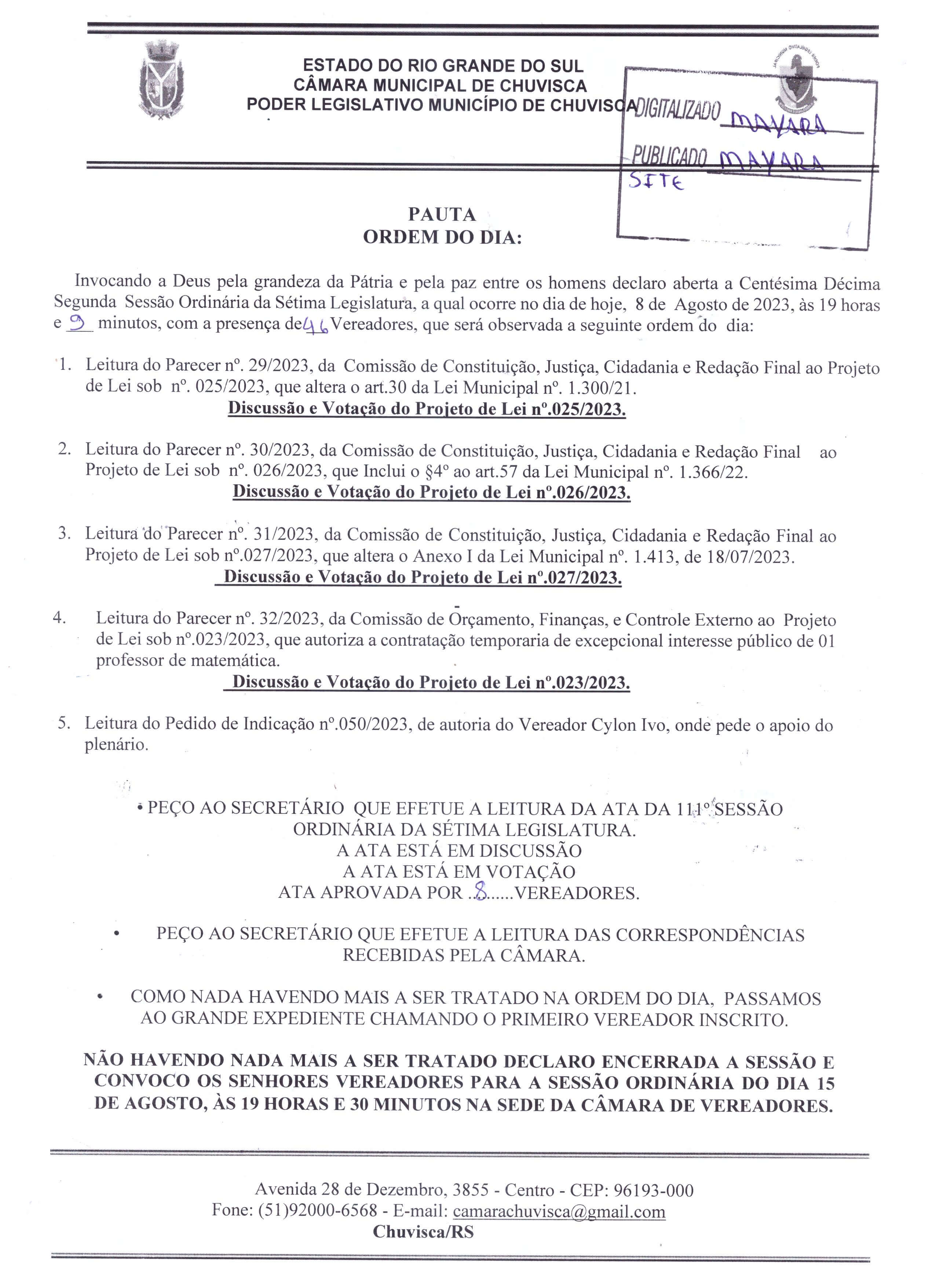 Ordem do dia 112º Sessão Ordinária da 7º Legislatura.