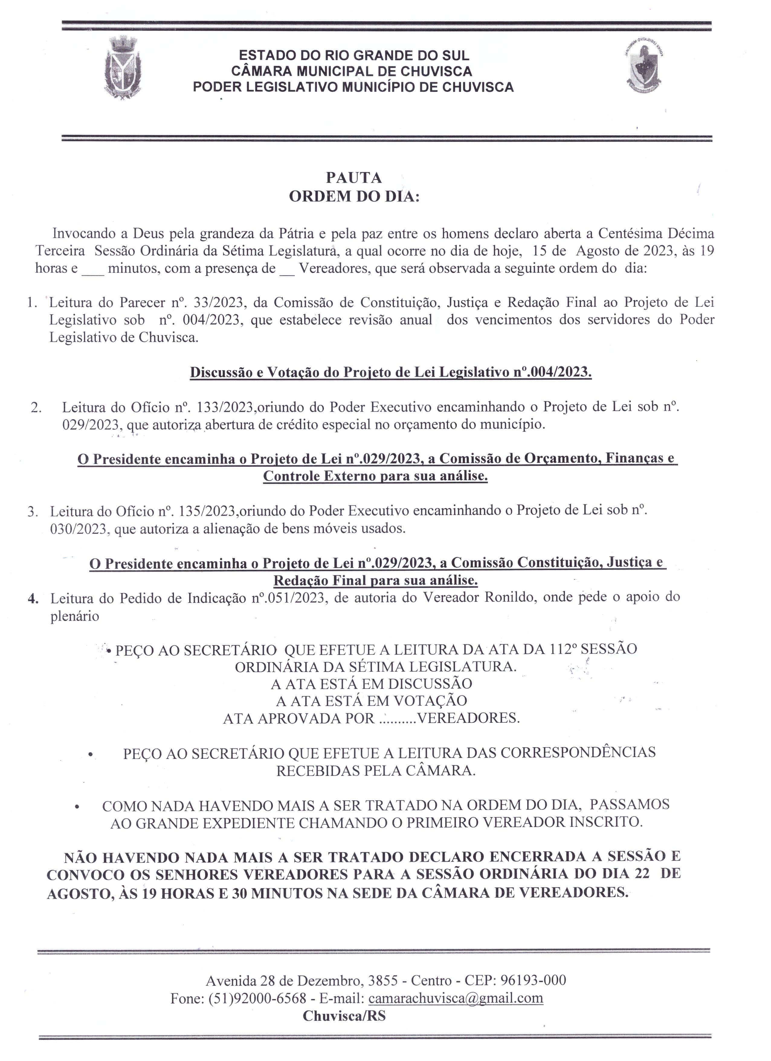 Odem do dia 113º Sessão Ordinária da 7º Legislatura.