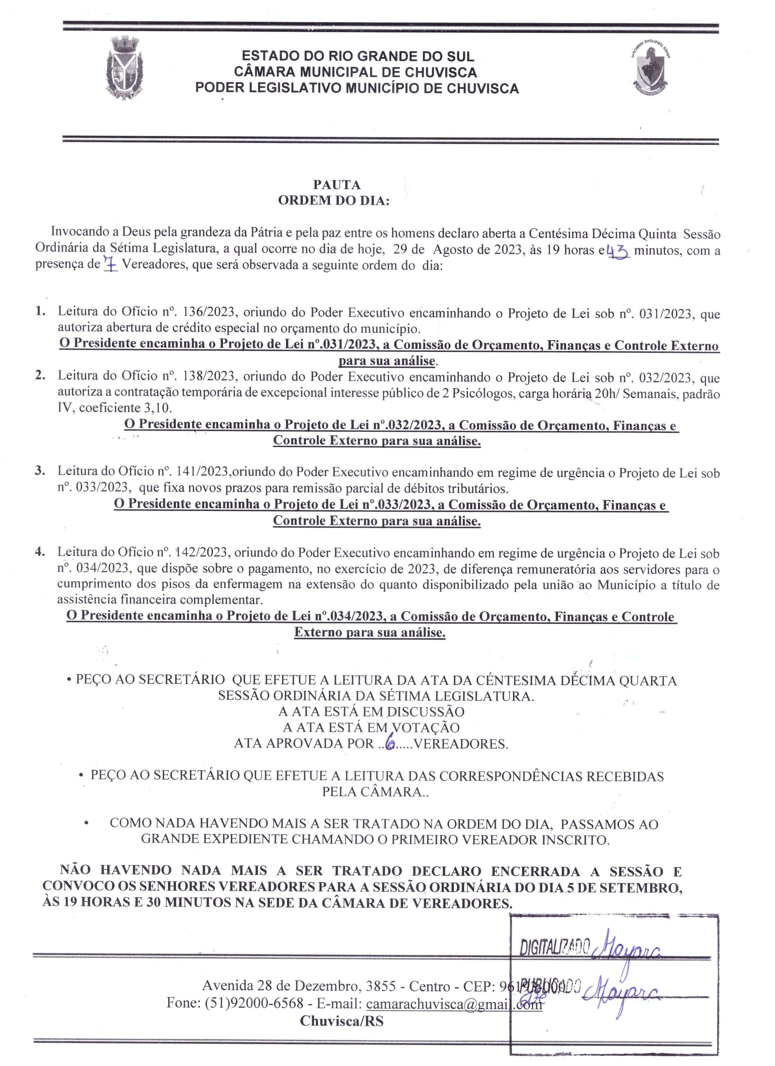 Odem do dia 115º Sessão Ordinária da 7º Legislatura.