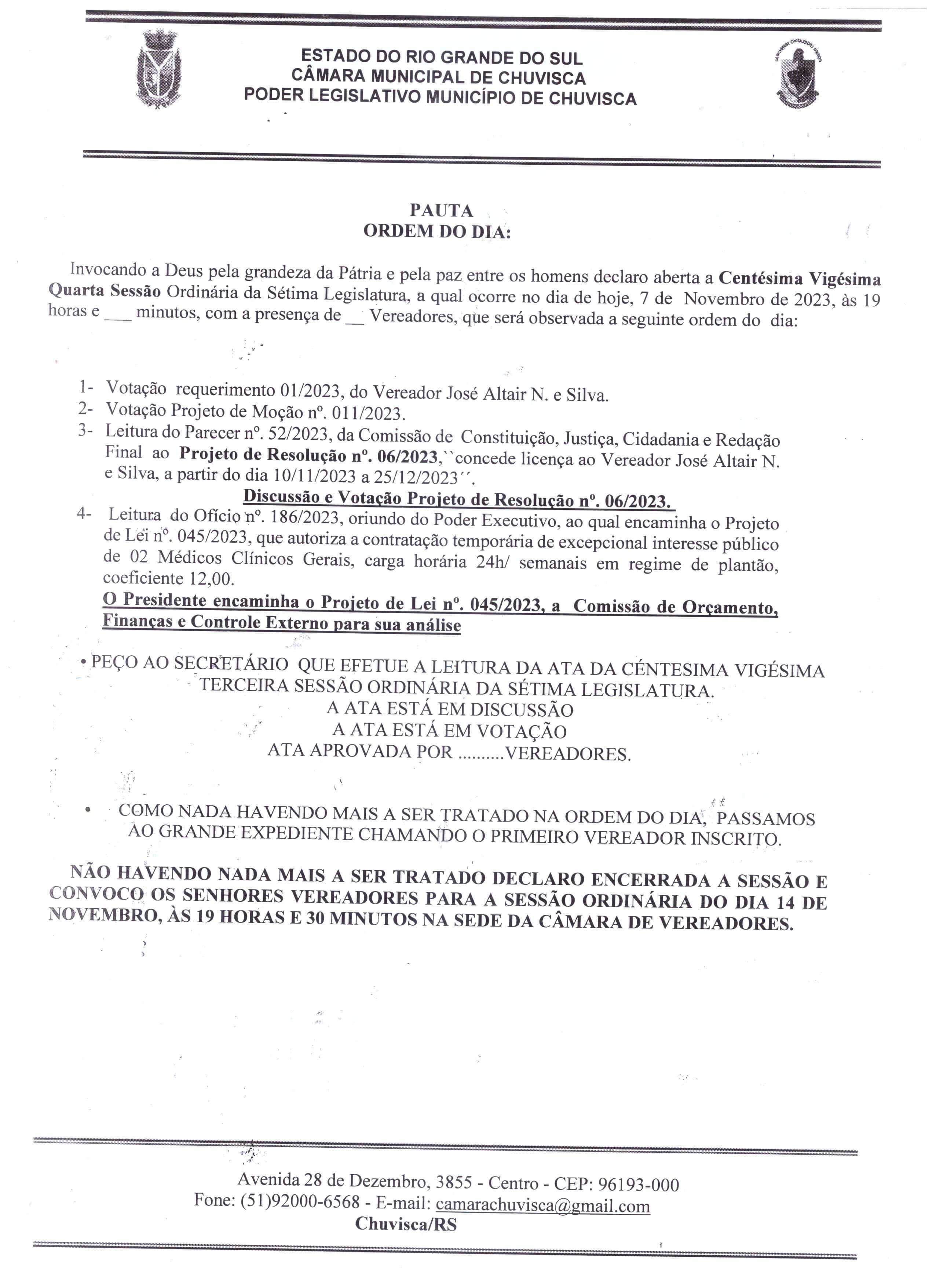 Ordem do dia 124º Sessão Ordinária da 7º Legislatura.