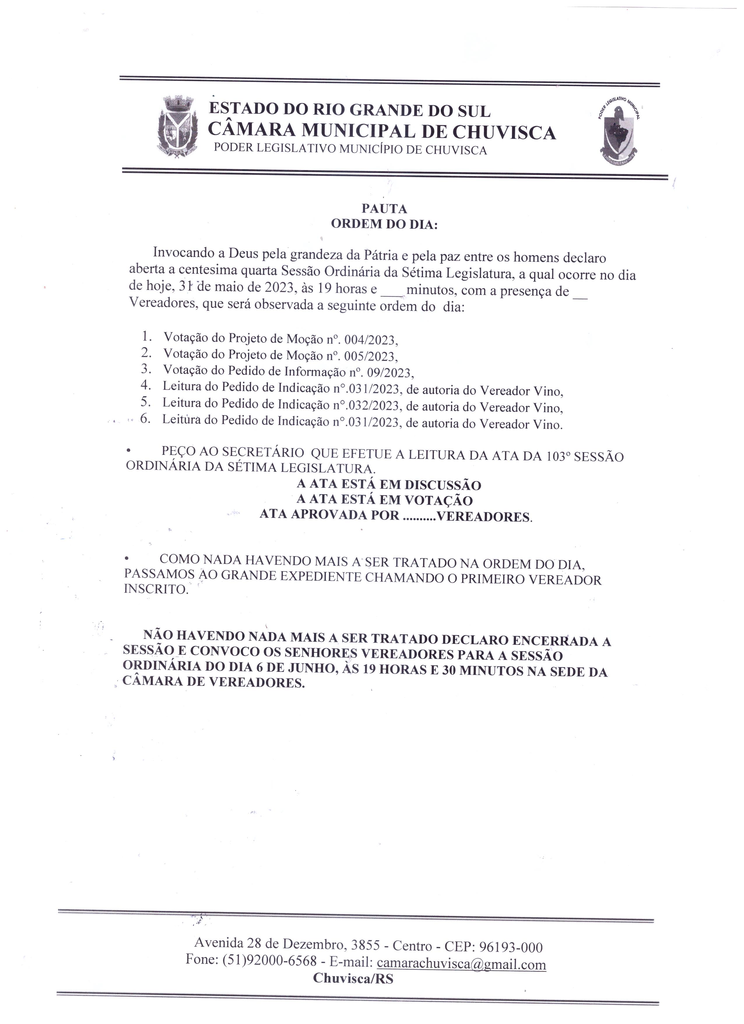 Ordem do dia 104º Sessão Ordinária da 7º Legislatura.