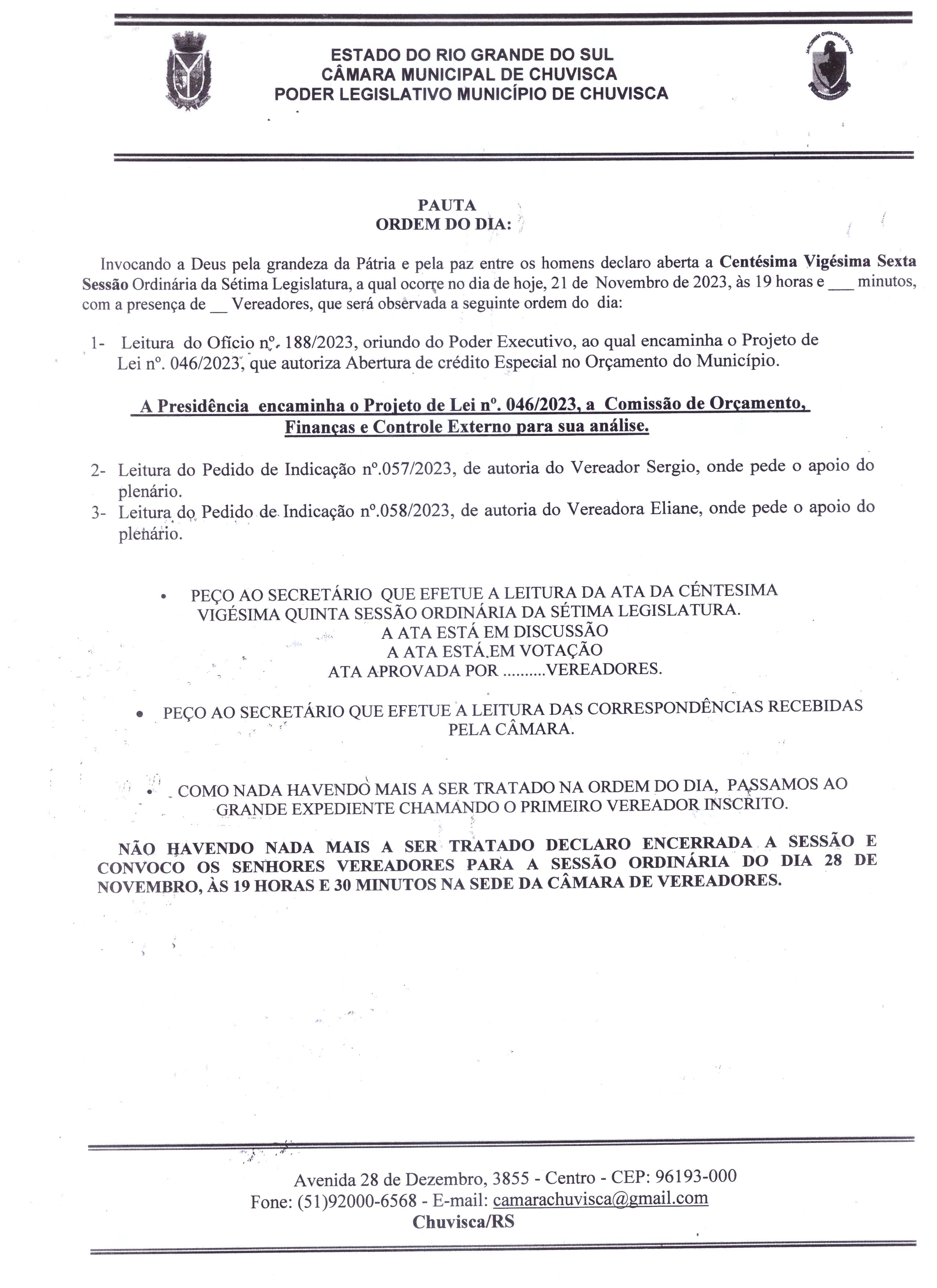 Ordem do dia 126º Sessão Ordinária da 7º Legislatura.