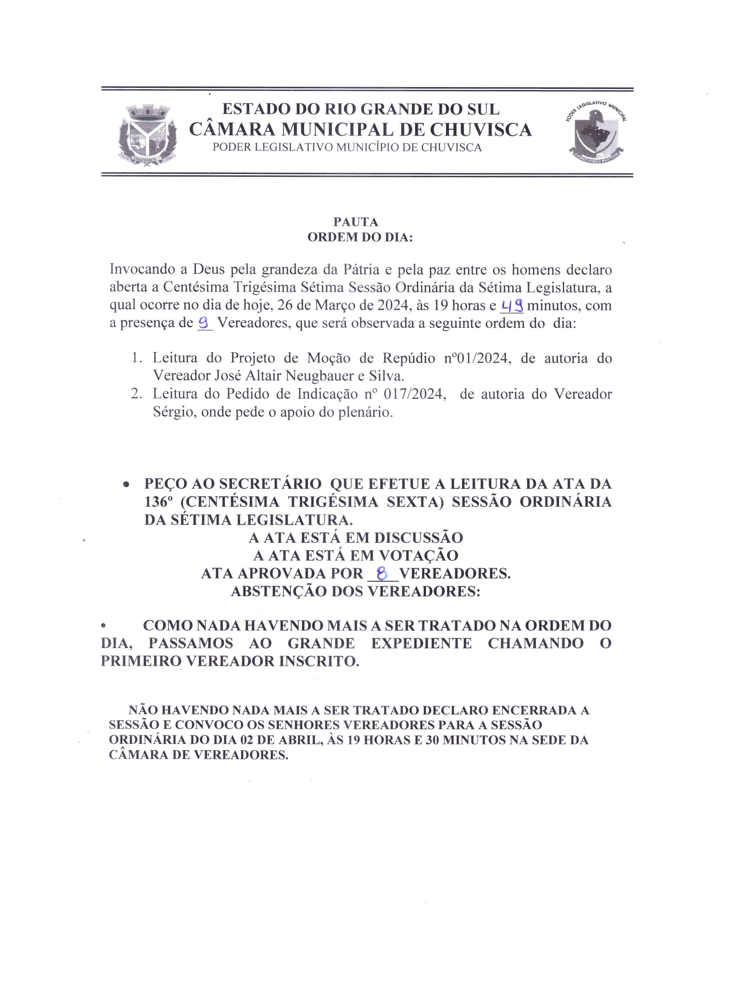 Ordem do Dia 137ª Sessão Ordinária