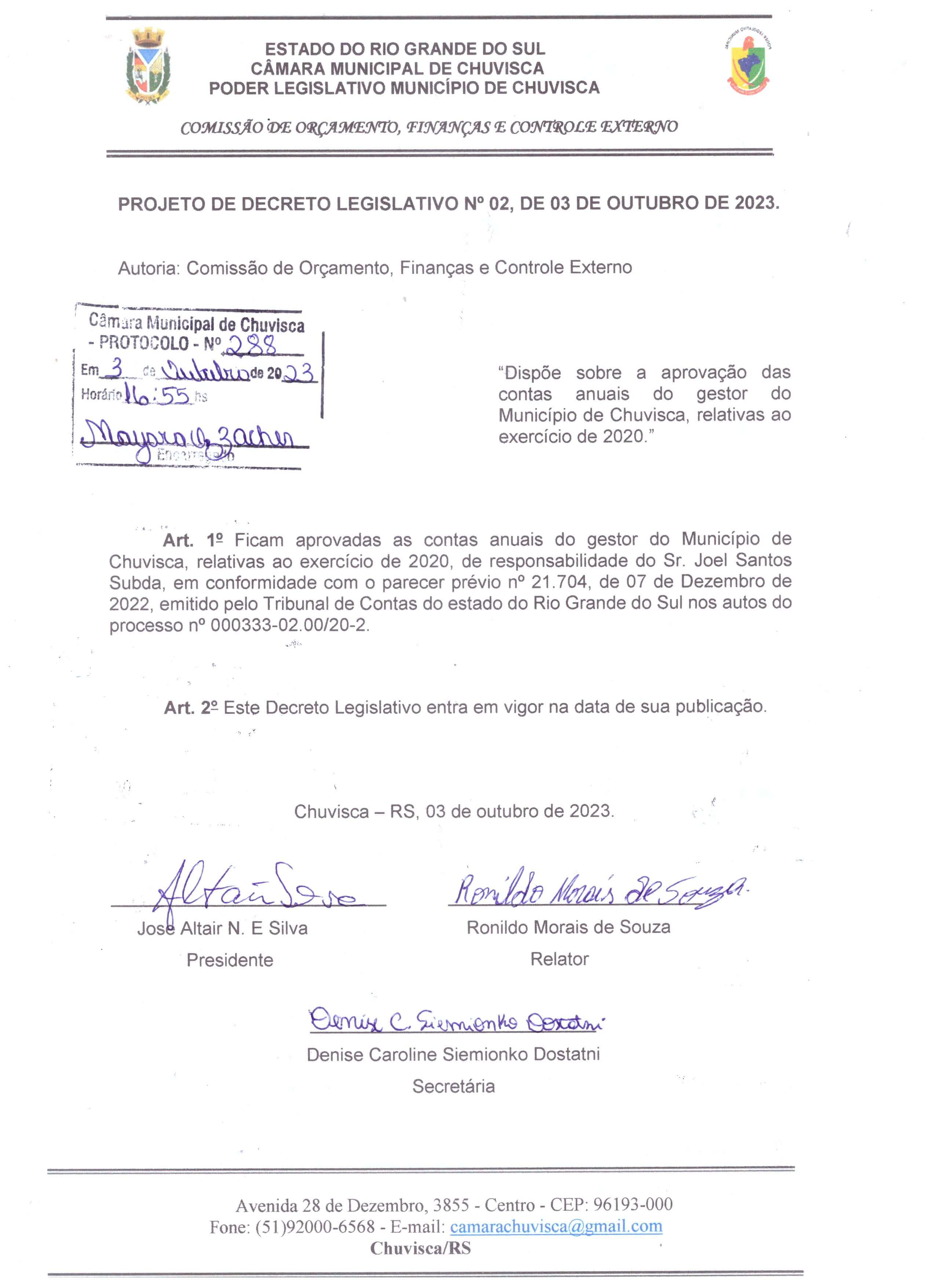 PROJETO DE DECRETO LEGISLATIVO Nº. 02, DE 3 DE OUTUBRO DE 2023