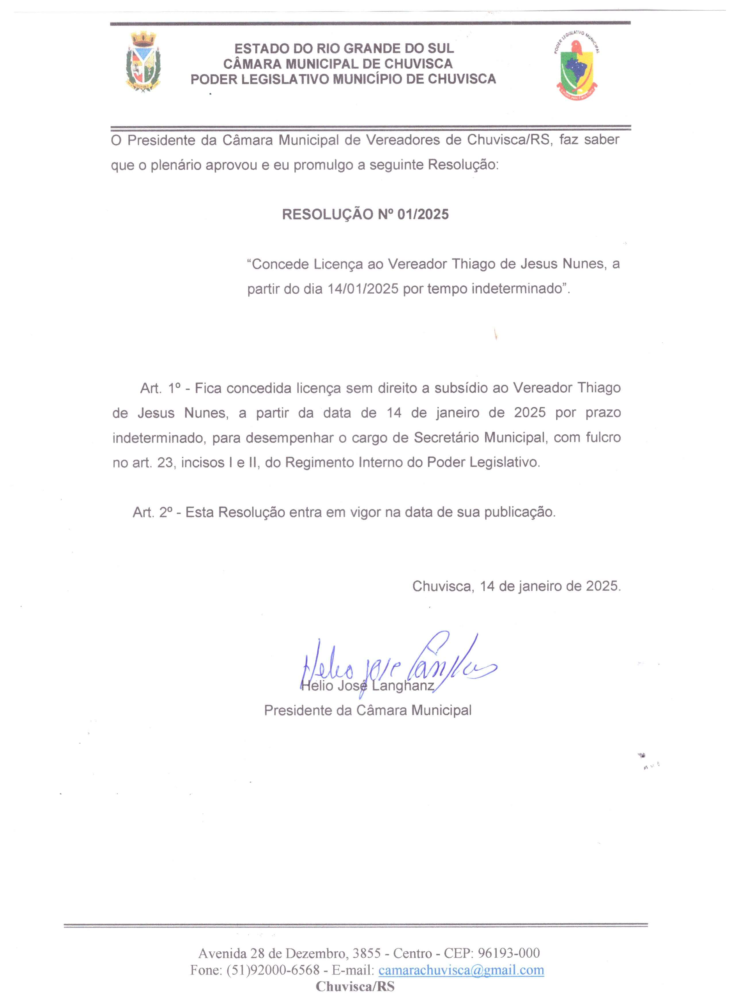 Resolução nº 01/2025, que Concede licença ao Vereador Thiago de Jesus Nunes, a partir do dia 14/01/2025 por tempo indeterminado.