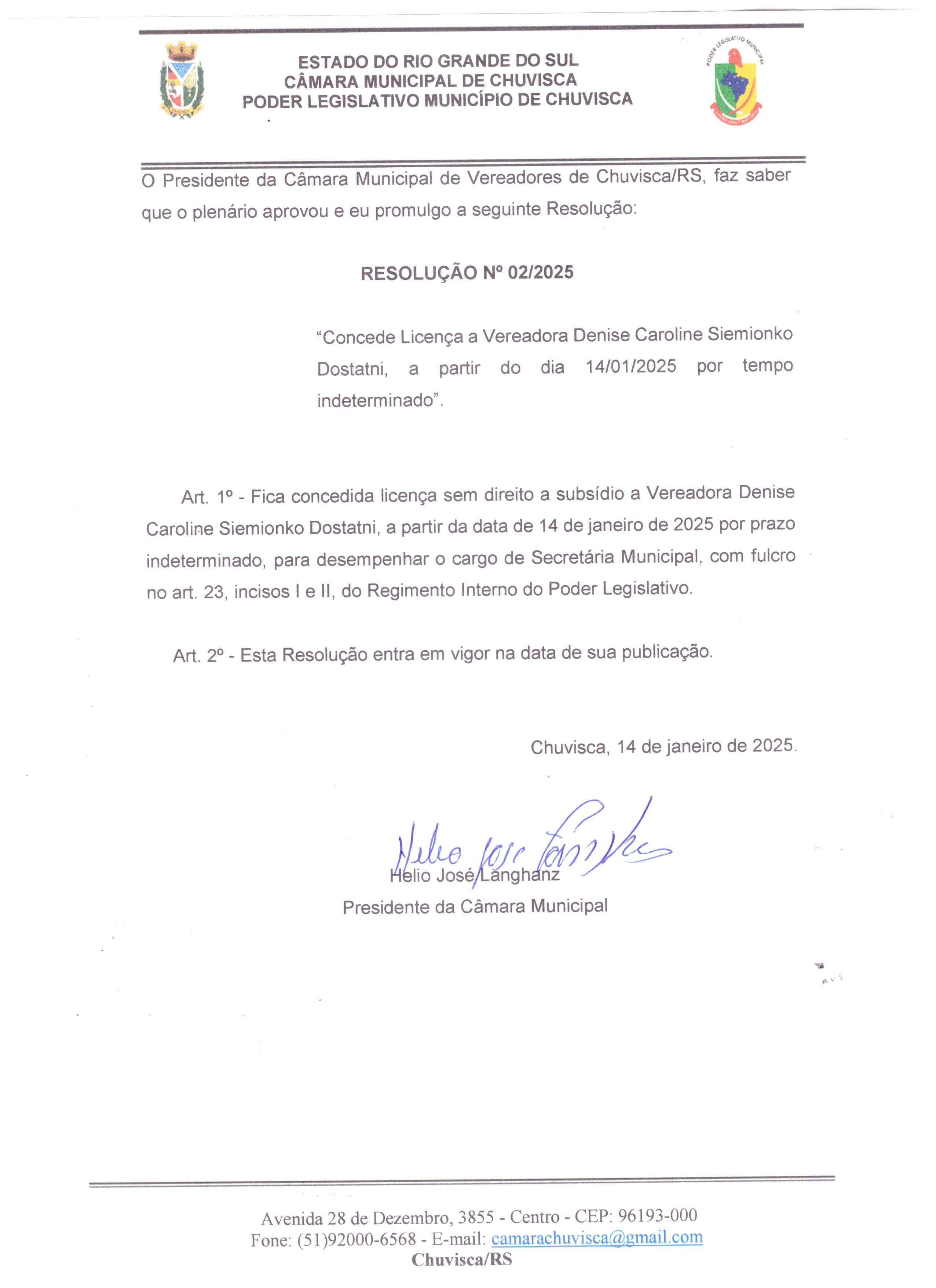 Resolução nº 02/2025, Concede licença a Vereadora Denise Caroline Siemionko Dostatni, a partir do dia 14/01/2025 por tempo indeterminado.