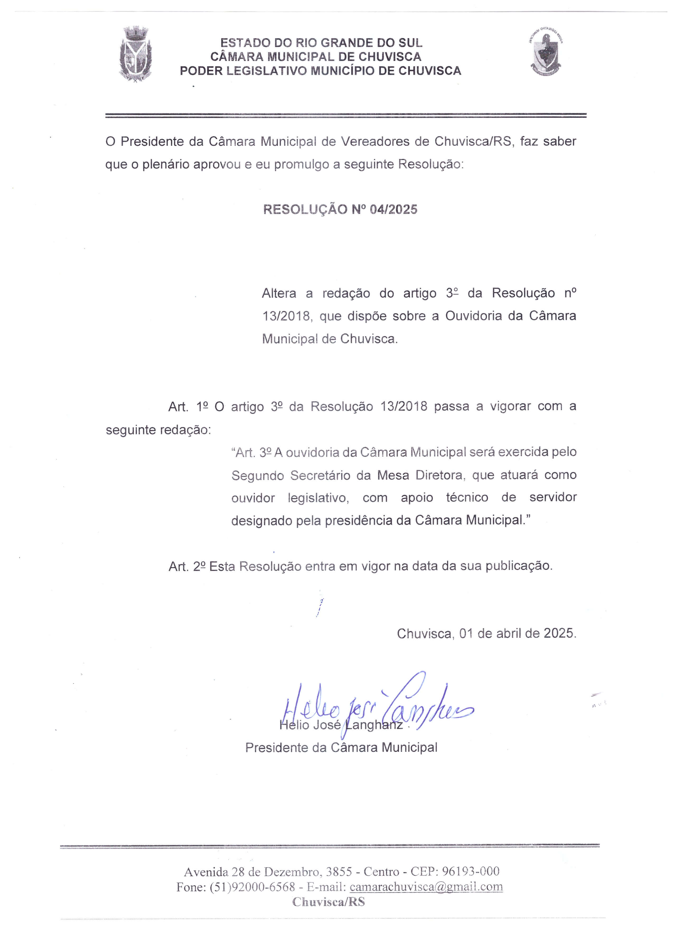 Resolução nº 04/2025, que altera a redação do artigo 3º da Resolução nº 13/2028, que dispõe sobre a Ouvidoria da Câmara Municipal de Chuvisca