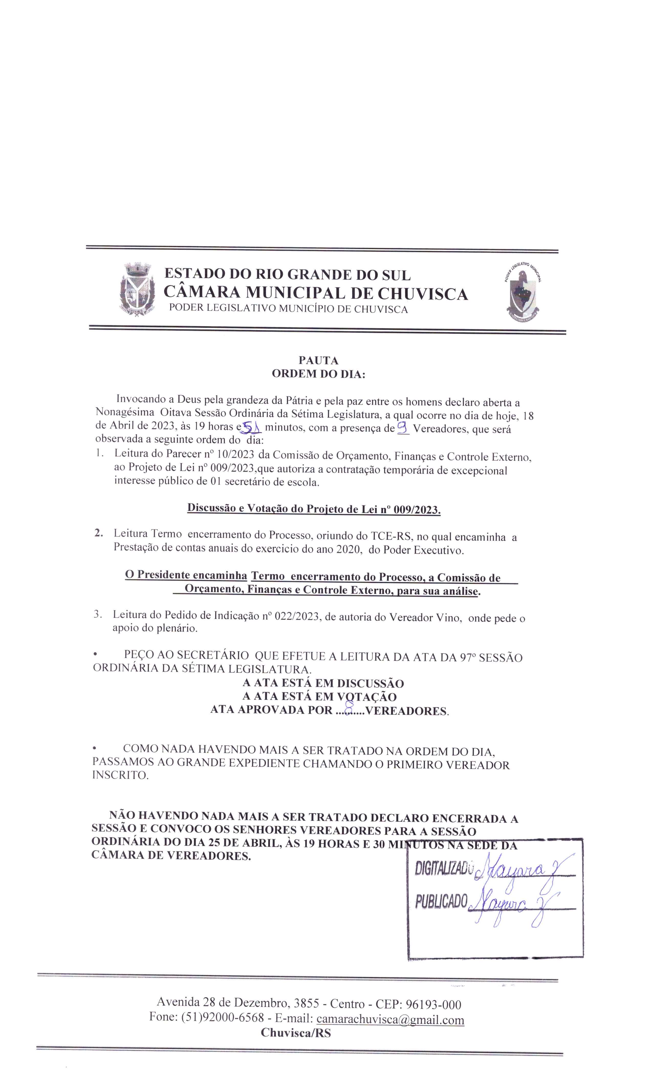 Ordem do dia 98º Sessão Ordinária da 7º Legislatura