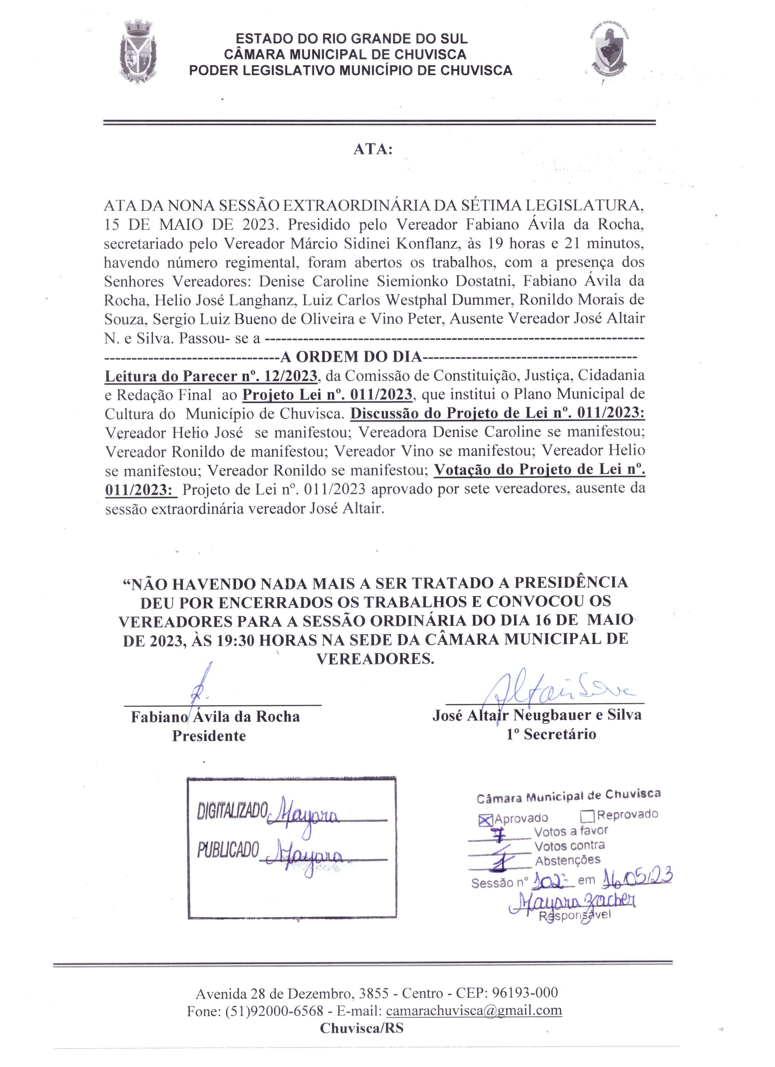 ATA 9º SESSÃO EXTRAORDINÁRIA DA 7º LEGISLATURA