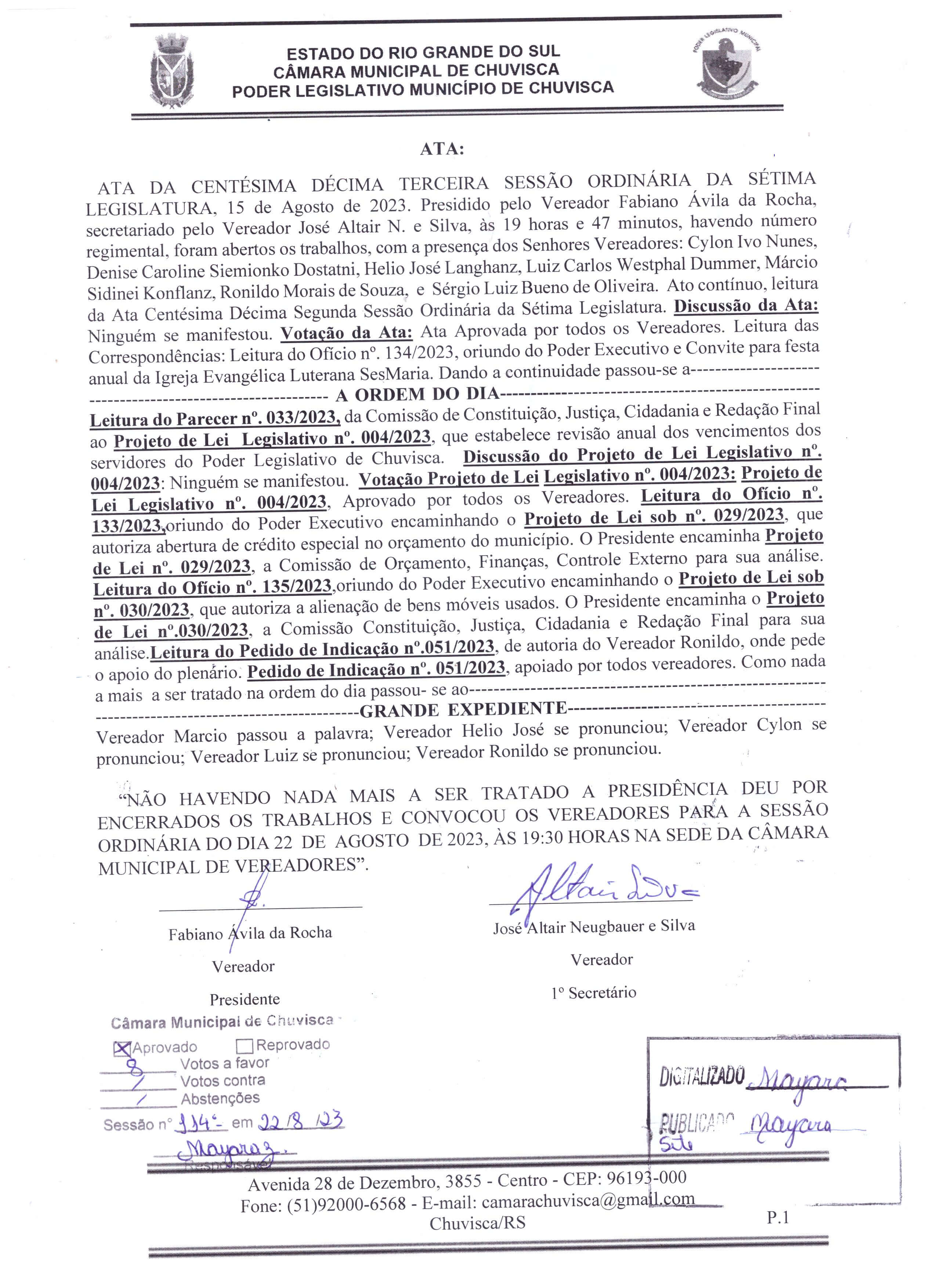 ATA 113º SESSÃO ORDINÁRIA DA 7º LEGISLATURA.
