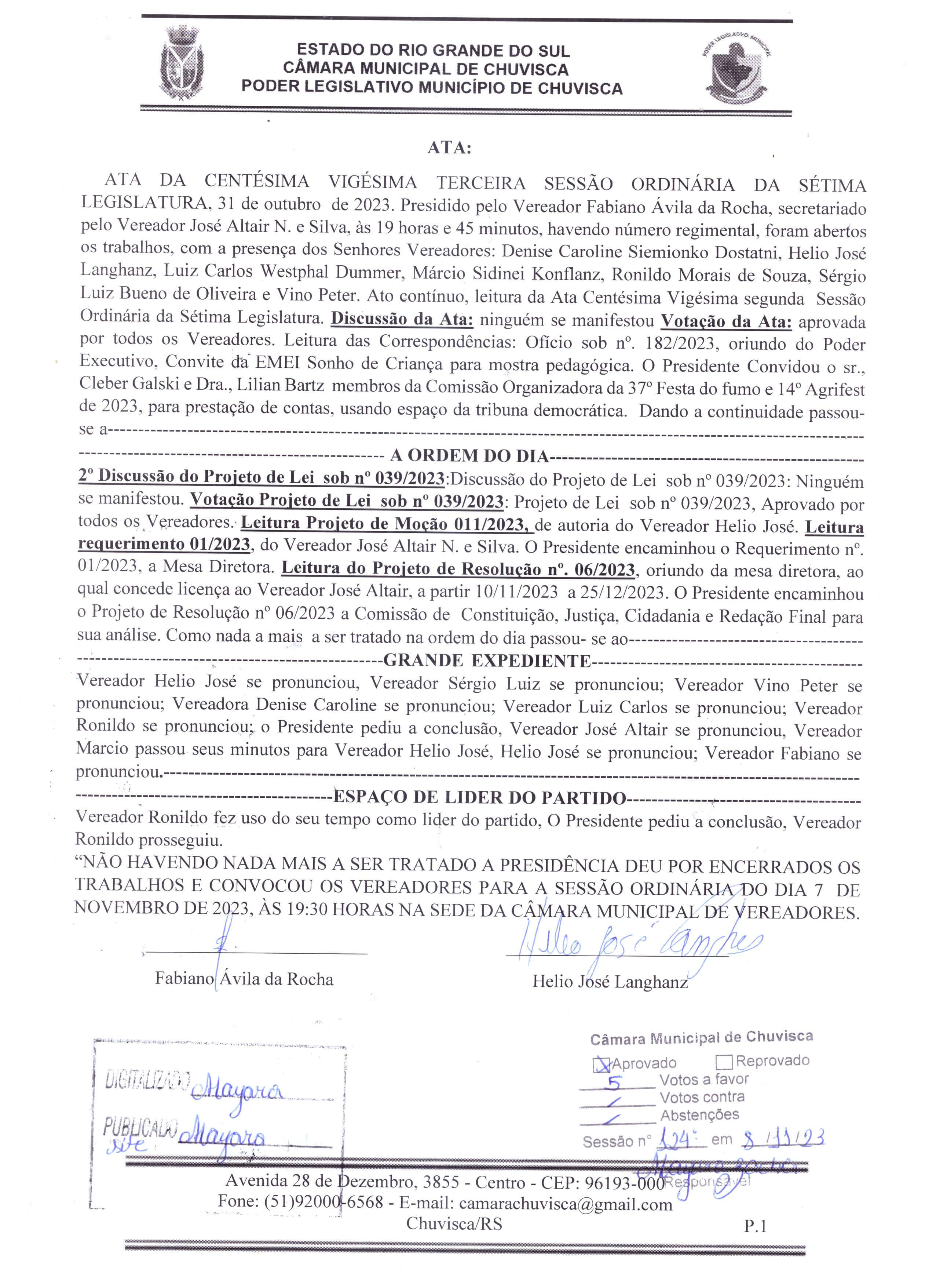 ATA 123º SESSÃO ORDINÁRIA DA 7º LEGISLATURA.