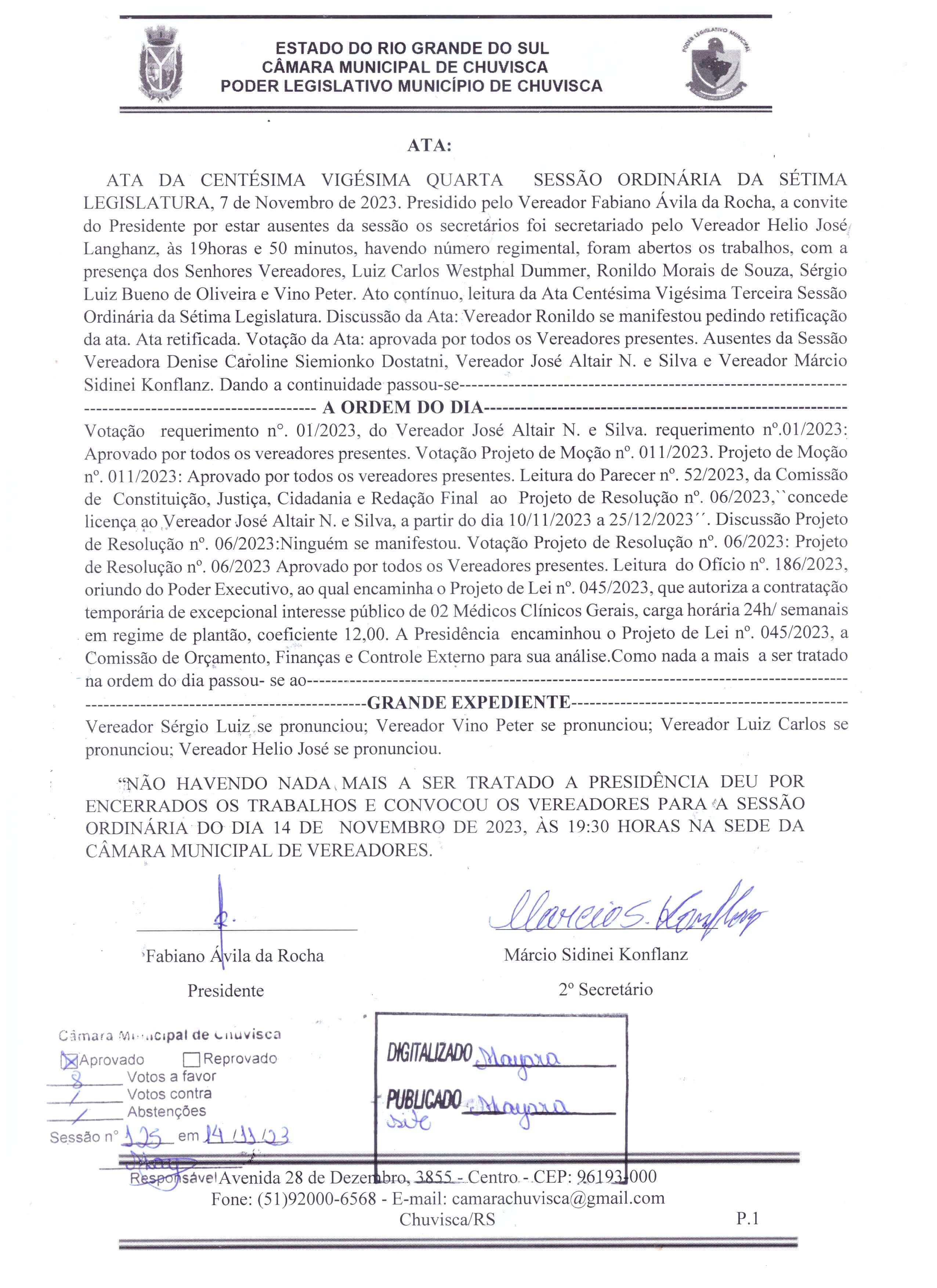 ATA 124º SESSÃO ORDINÁRIA DA 7º LEGISLATURA.