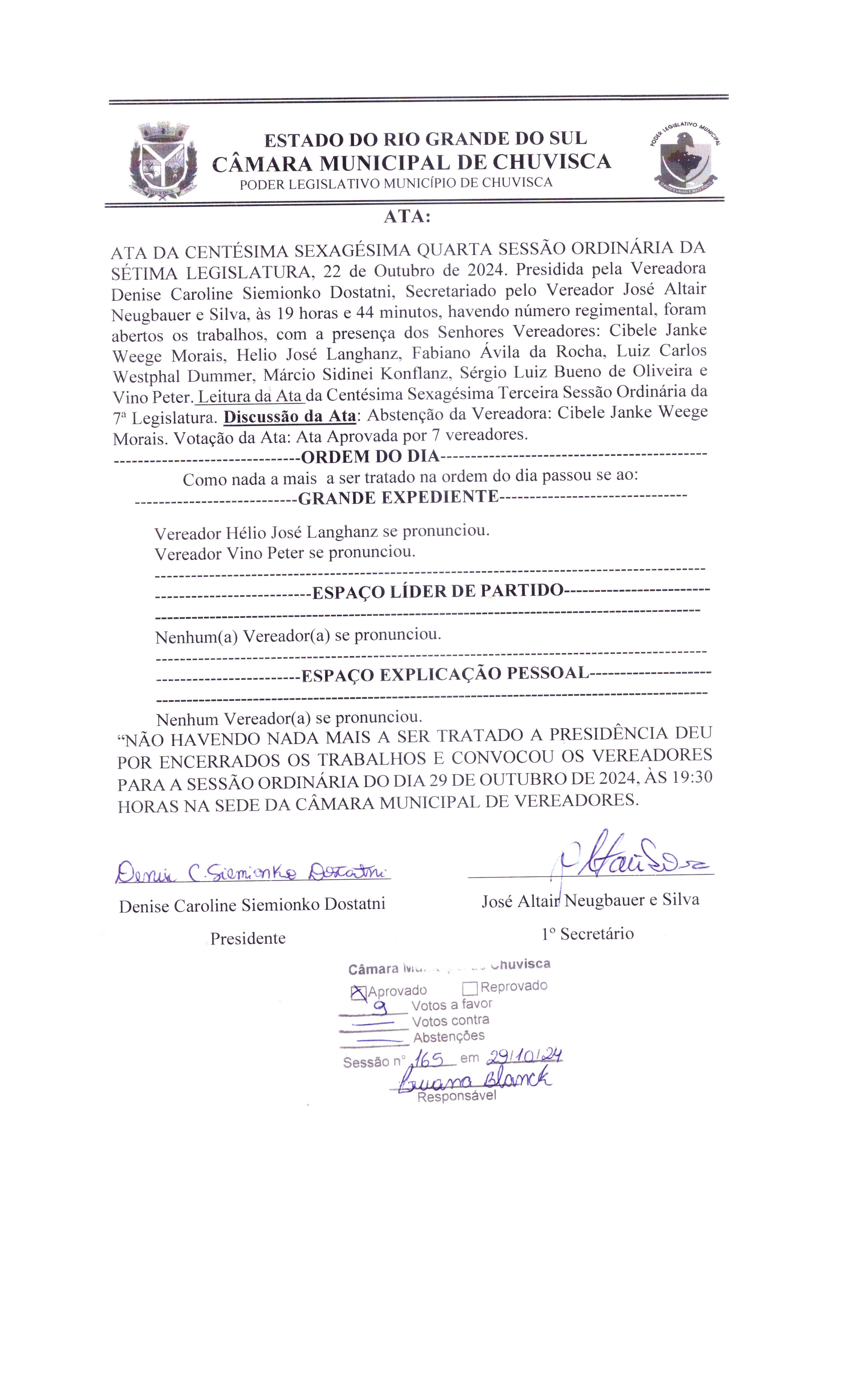 Texto: Ata da 164ª Sessão Ordinária da 7ª Legislatura