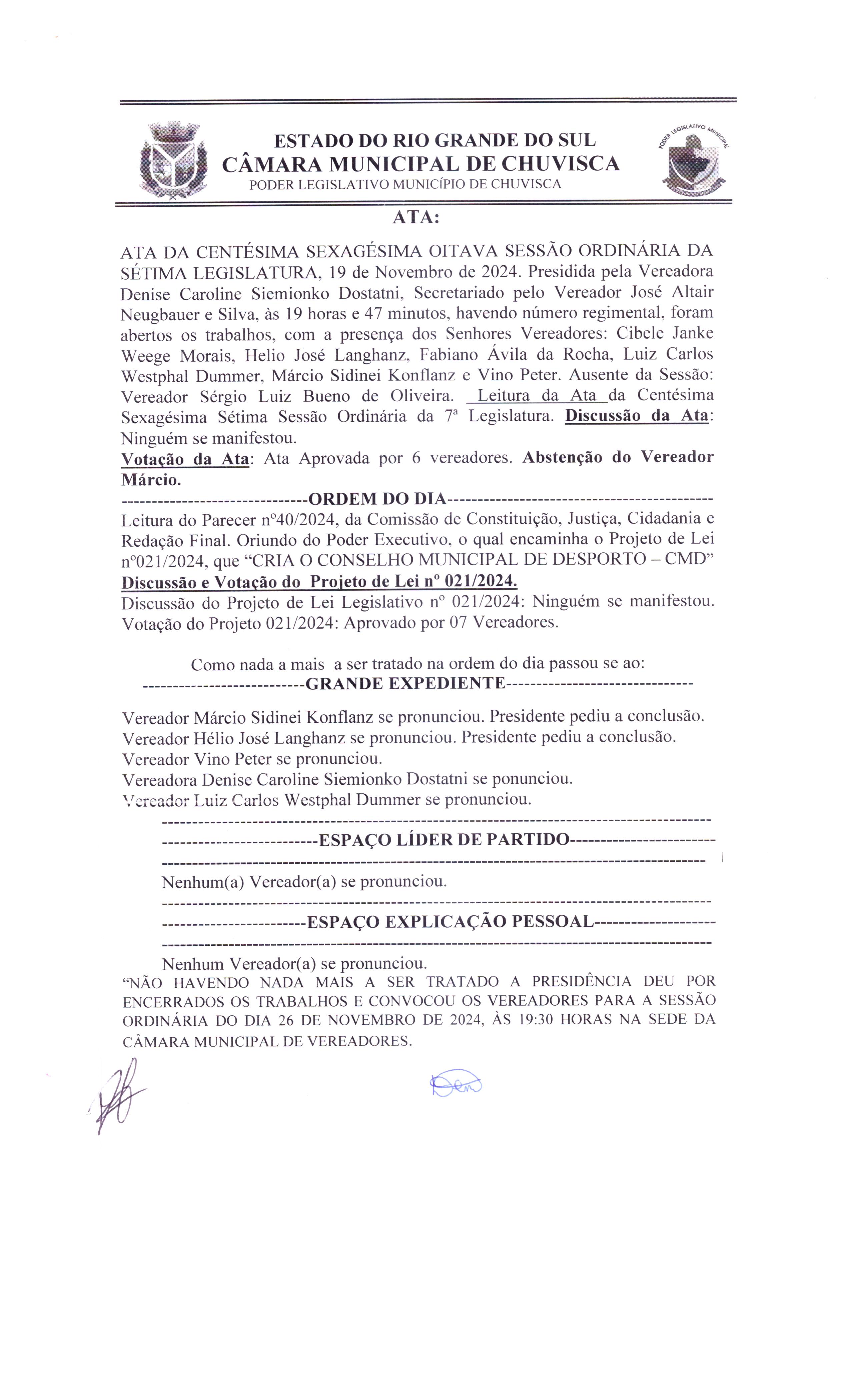 Texto: Ata da 168ª Sessão Ordinária da 7ª Legislatura