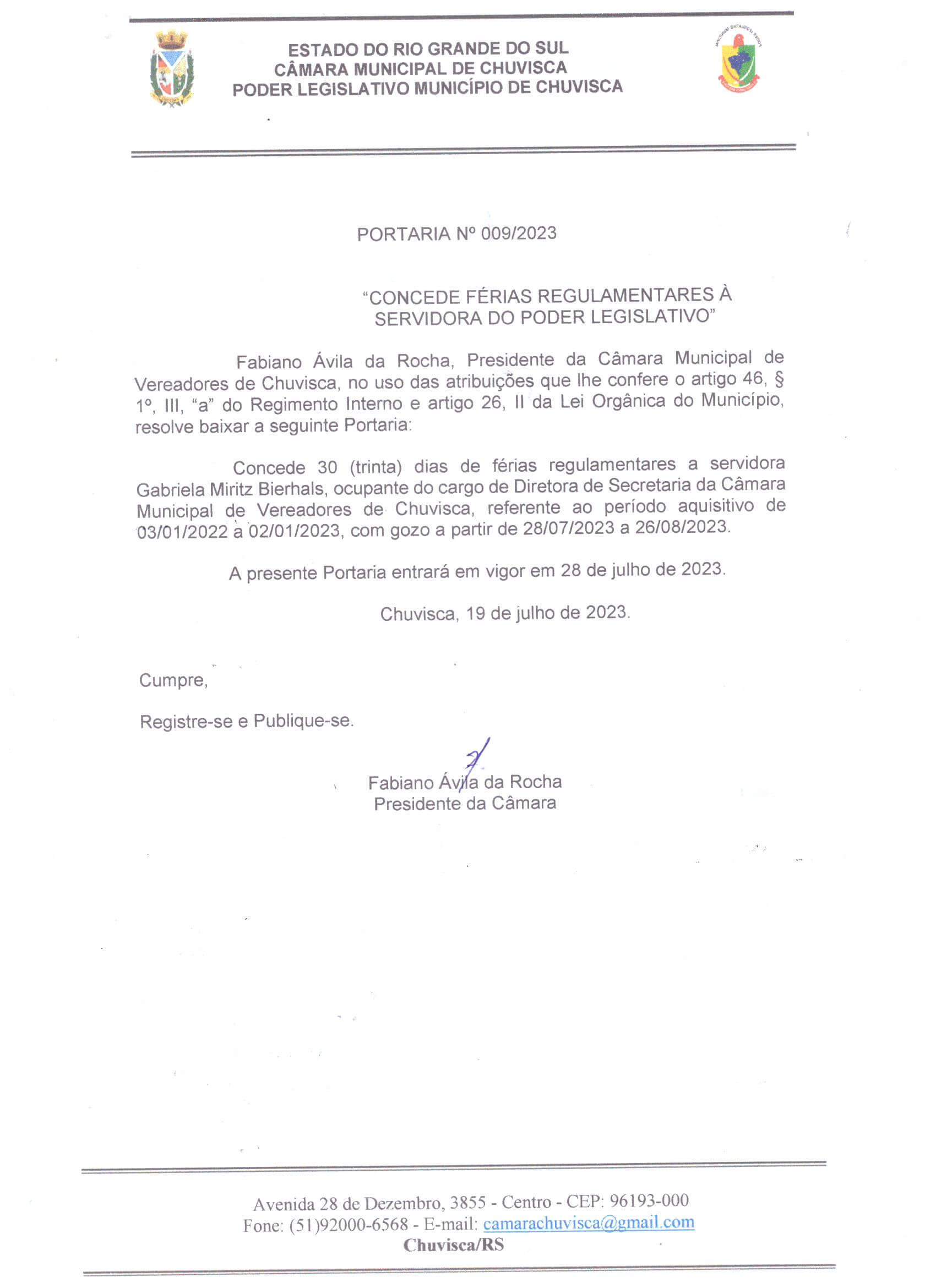 Portaria 009/2023, que concede férias a servidora Gabriela Miritz.