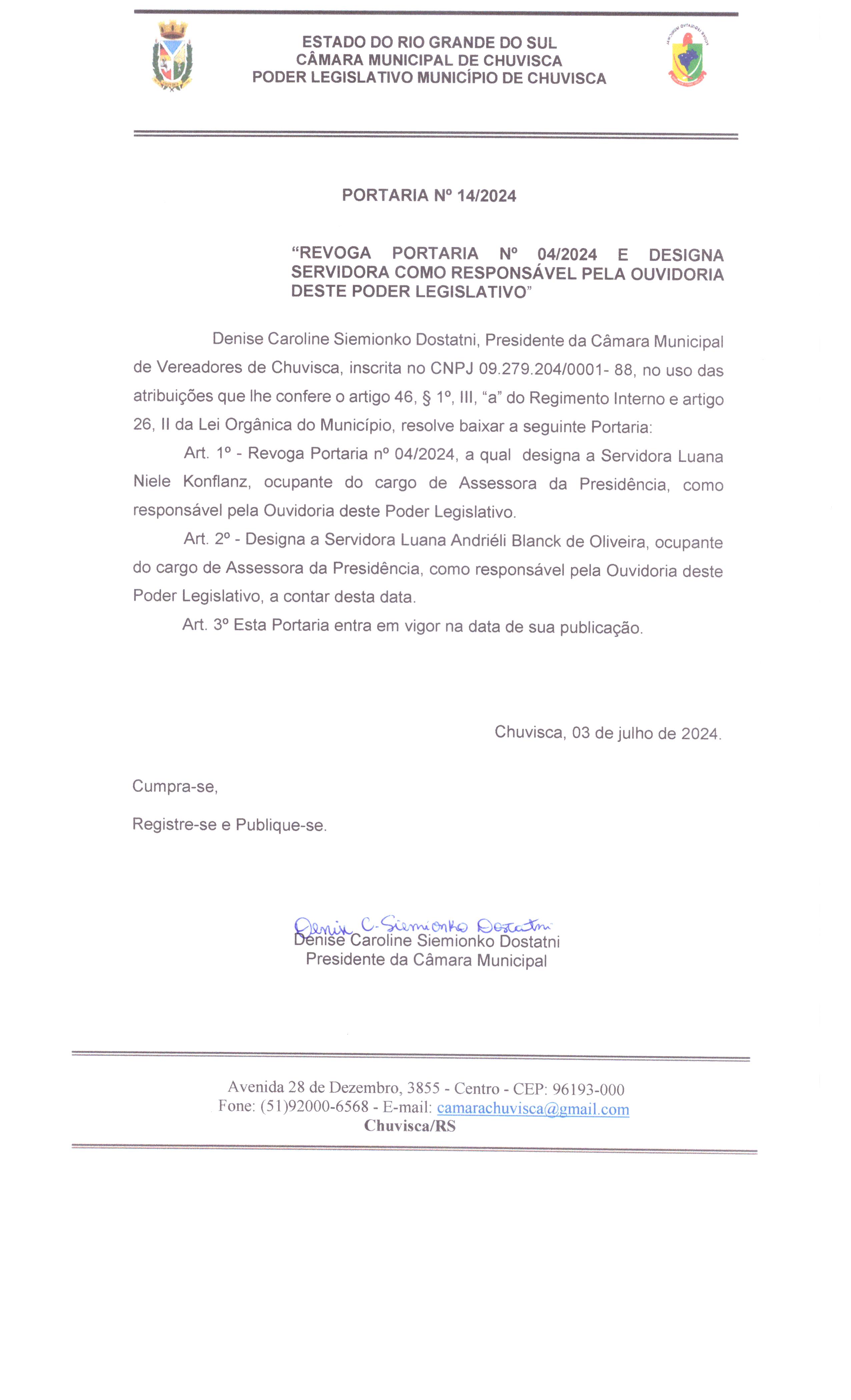 Revoga Portaria nº 04/2024 e designa Servidora Responsável pela Ouvidoria.